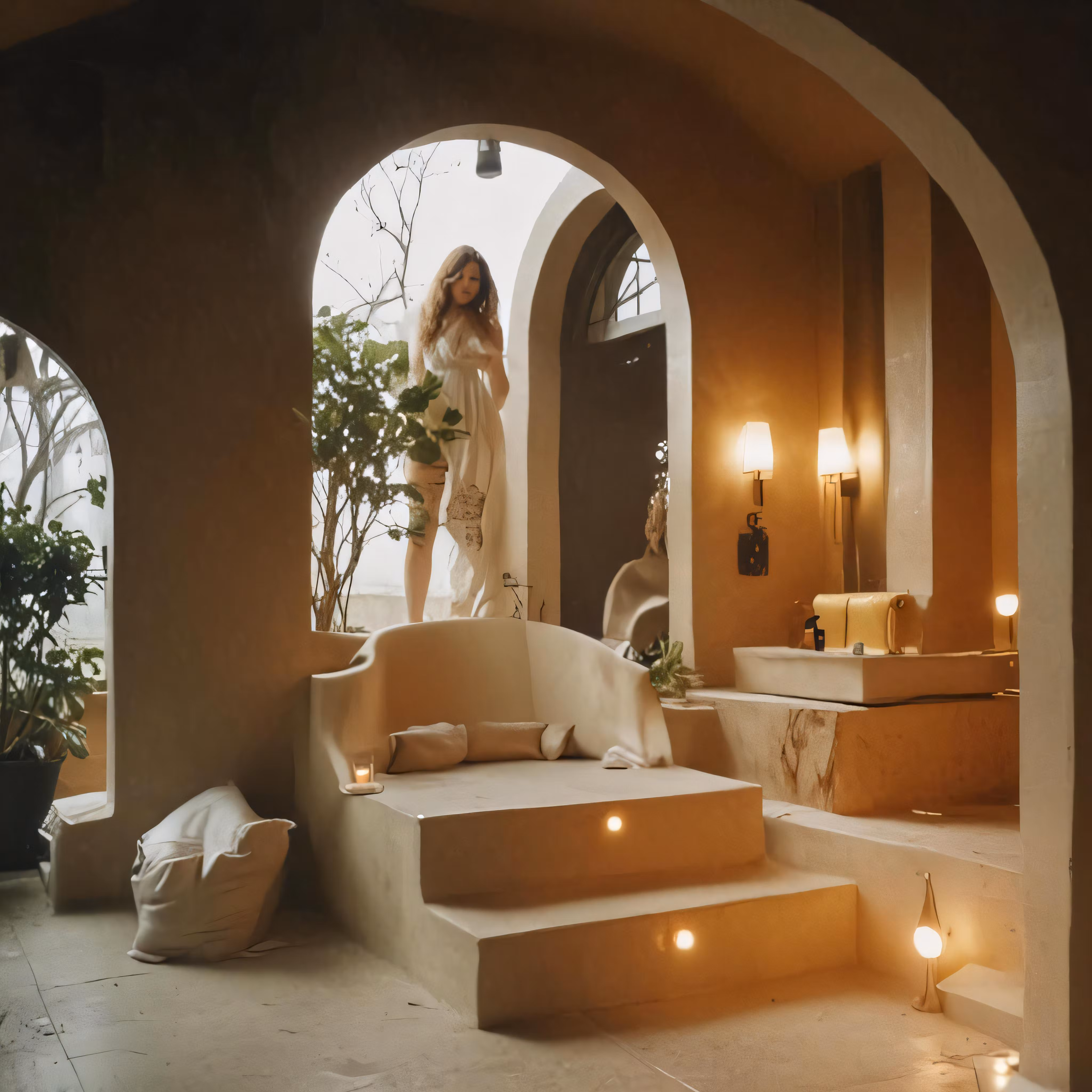 High resolution picture, free to use, a woman is walking down steps in a bathroom