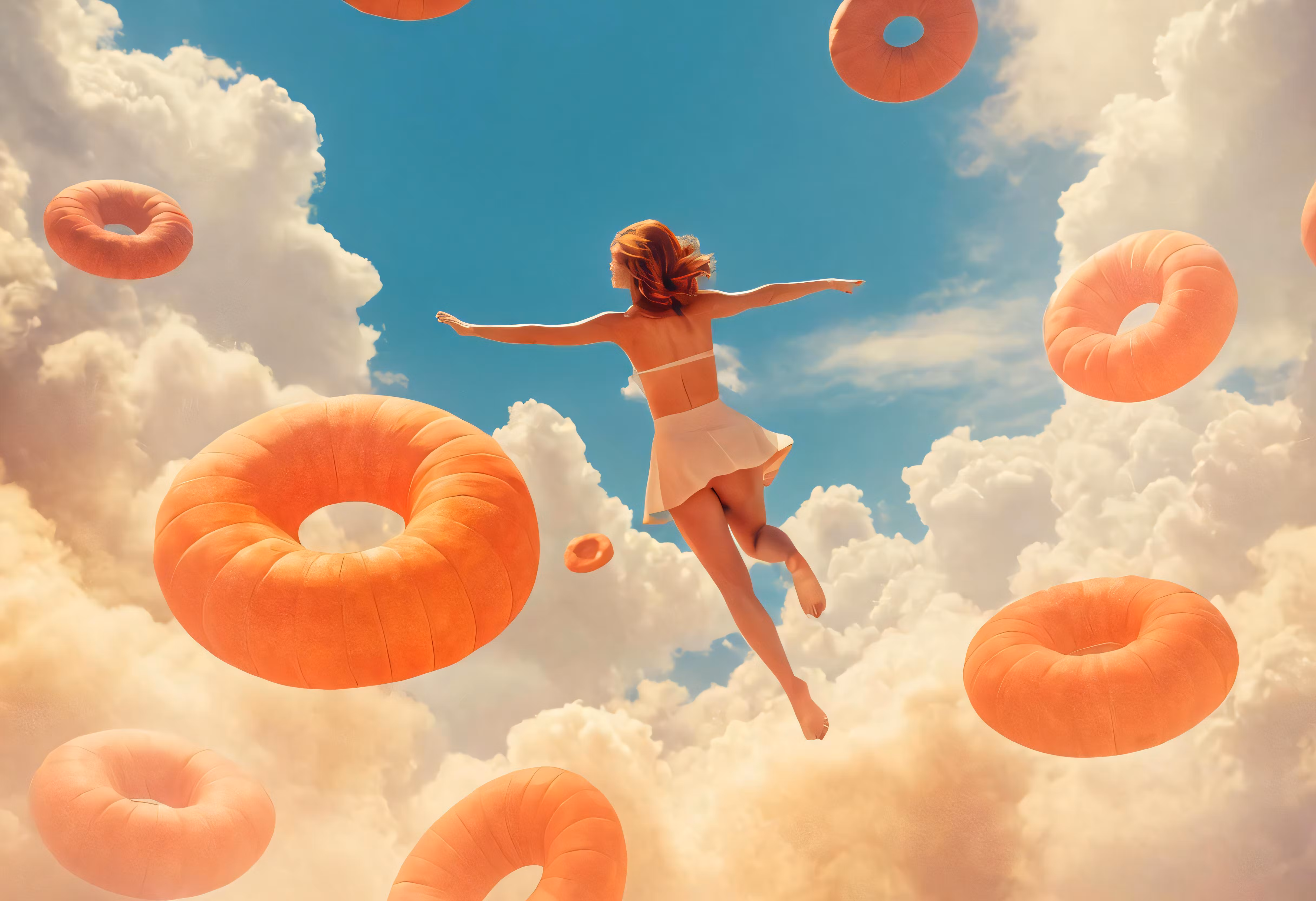 High resolution picture, free to use, a woman jumping with floating donuts in the air