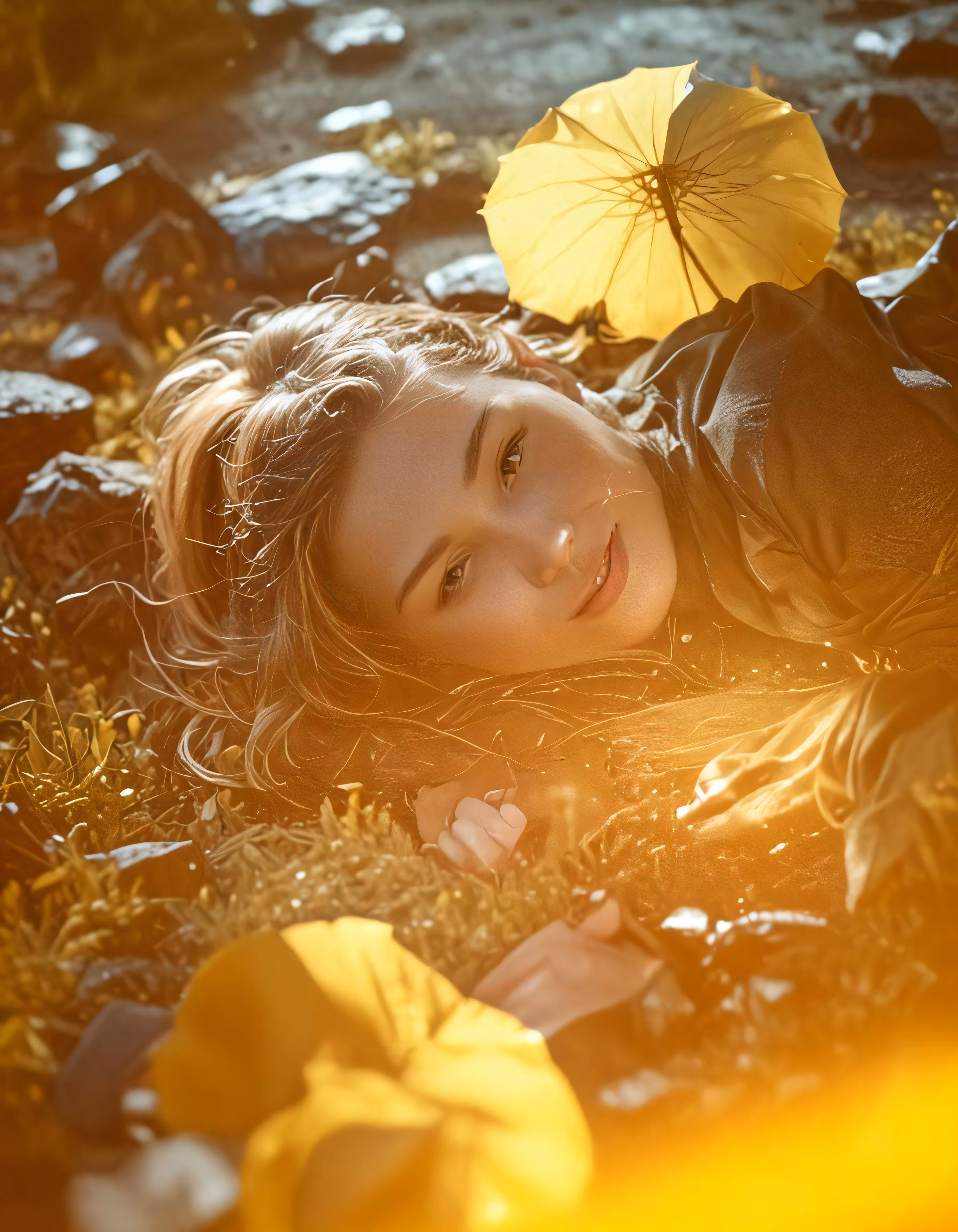 High resolution picture, free to use, a woman laying on the ground with two yellow umbrellas