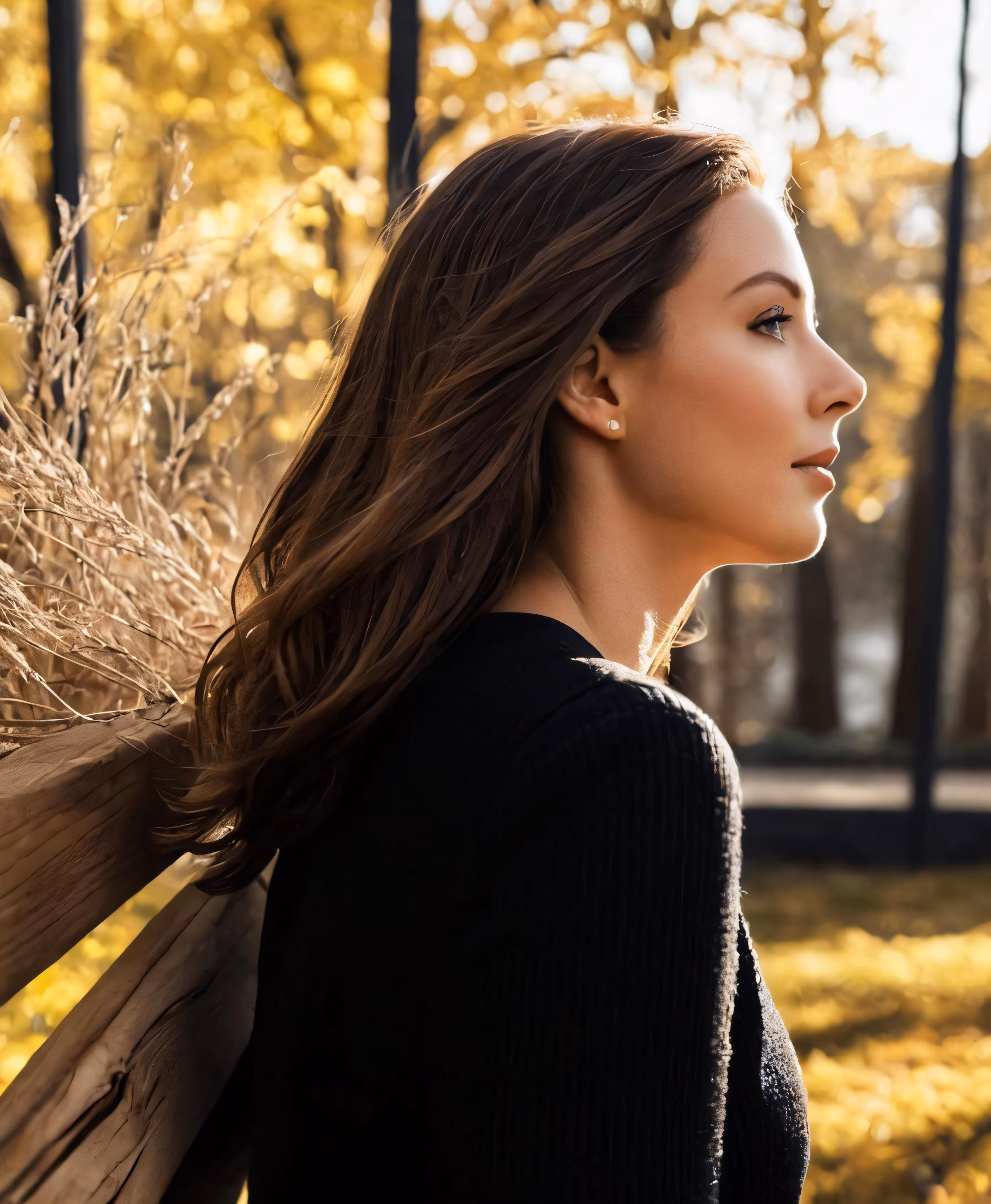 High resolution picture, free to use, a woman leaning on a wooden bench in a park