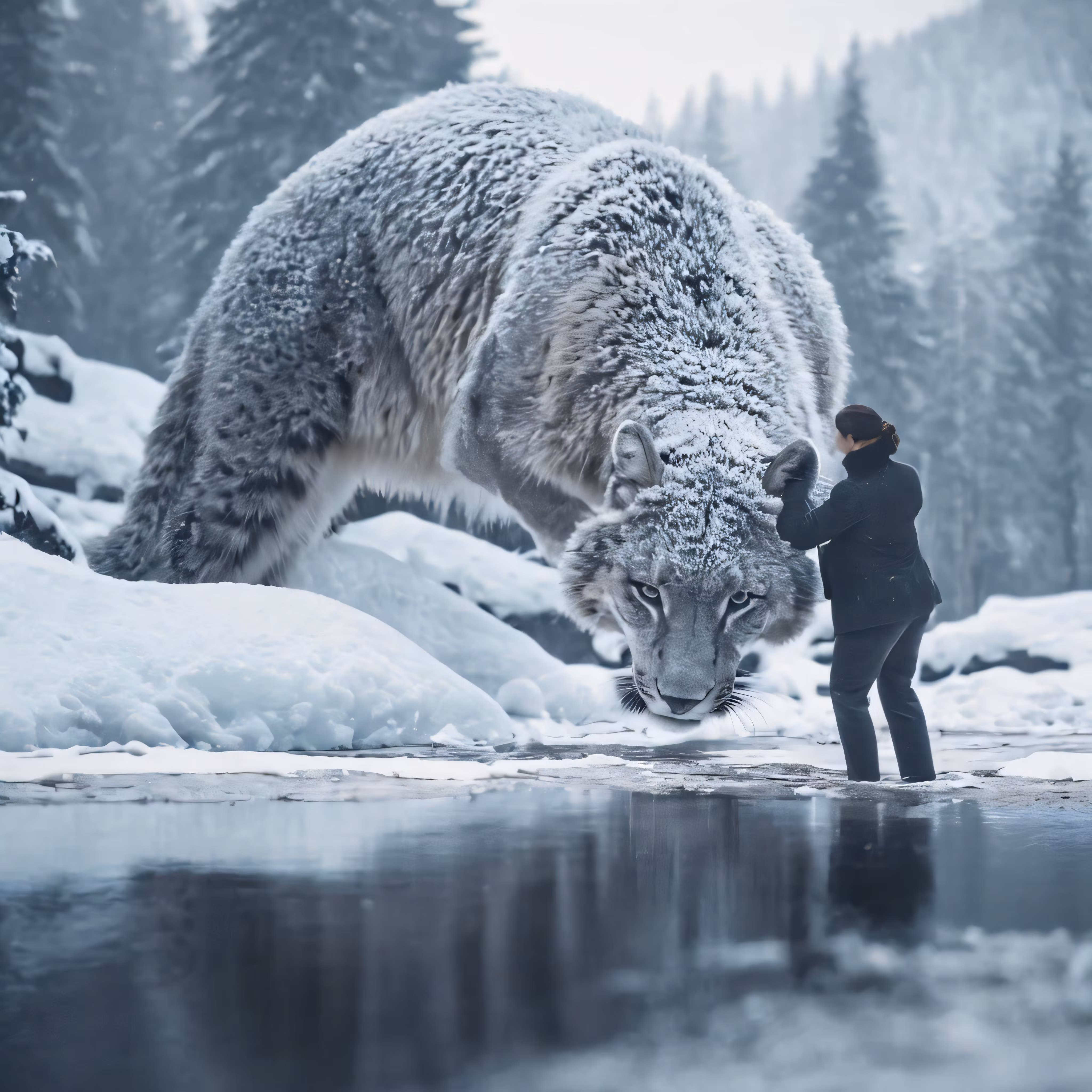 High resolution picture, free to use, a woman petting a big snow animal on a river bank