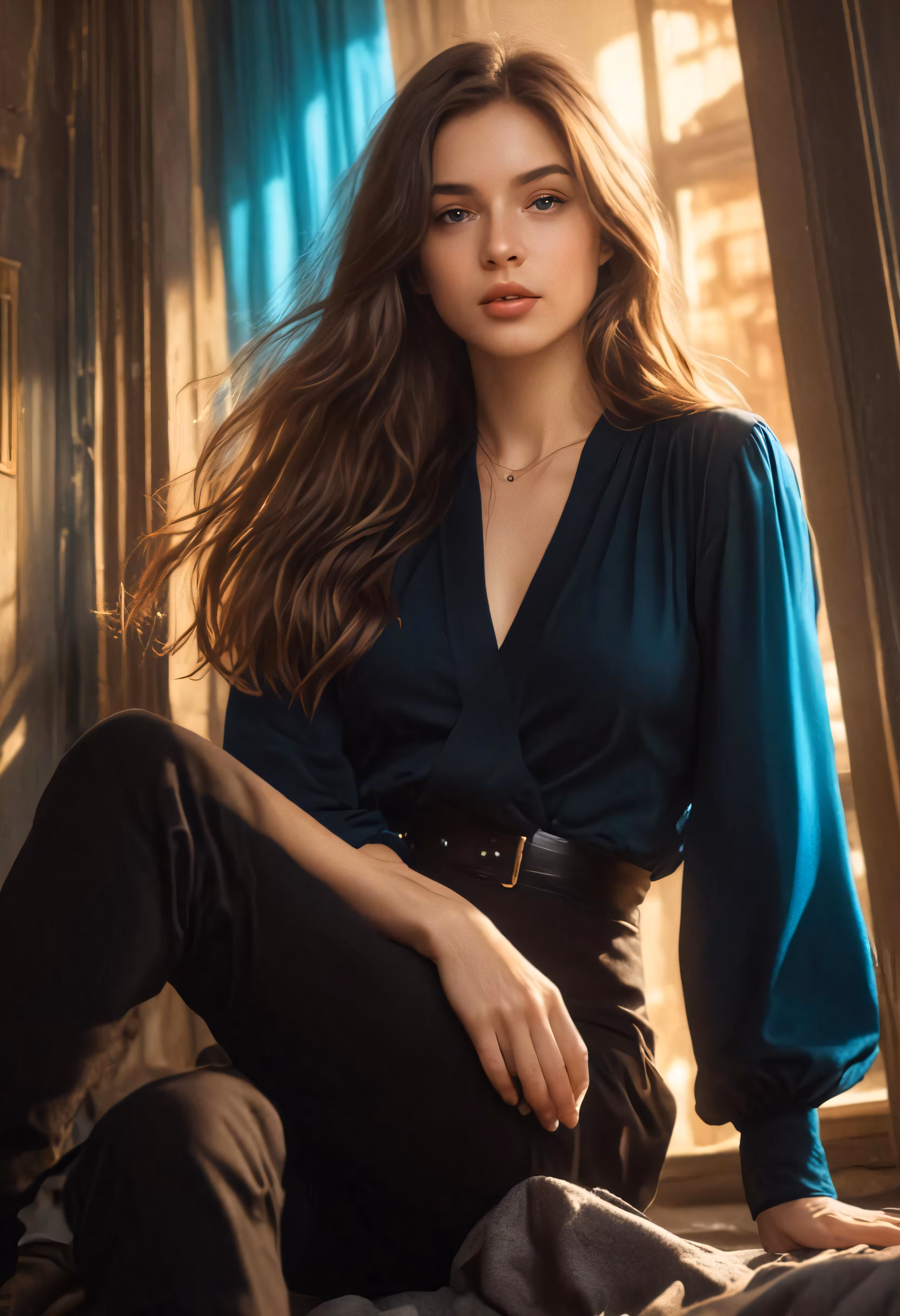 High resolution picture, free to use, a woman posing in a blue blouse and brown pants