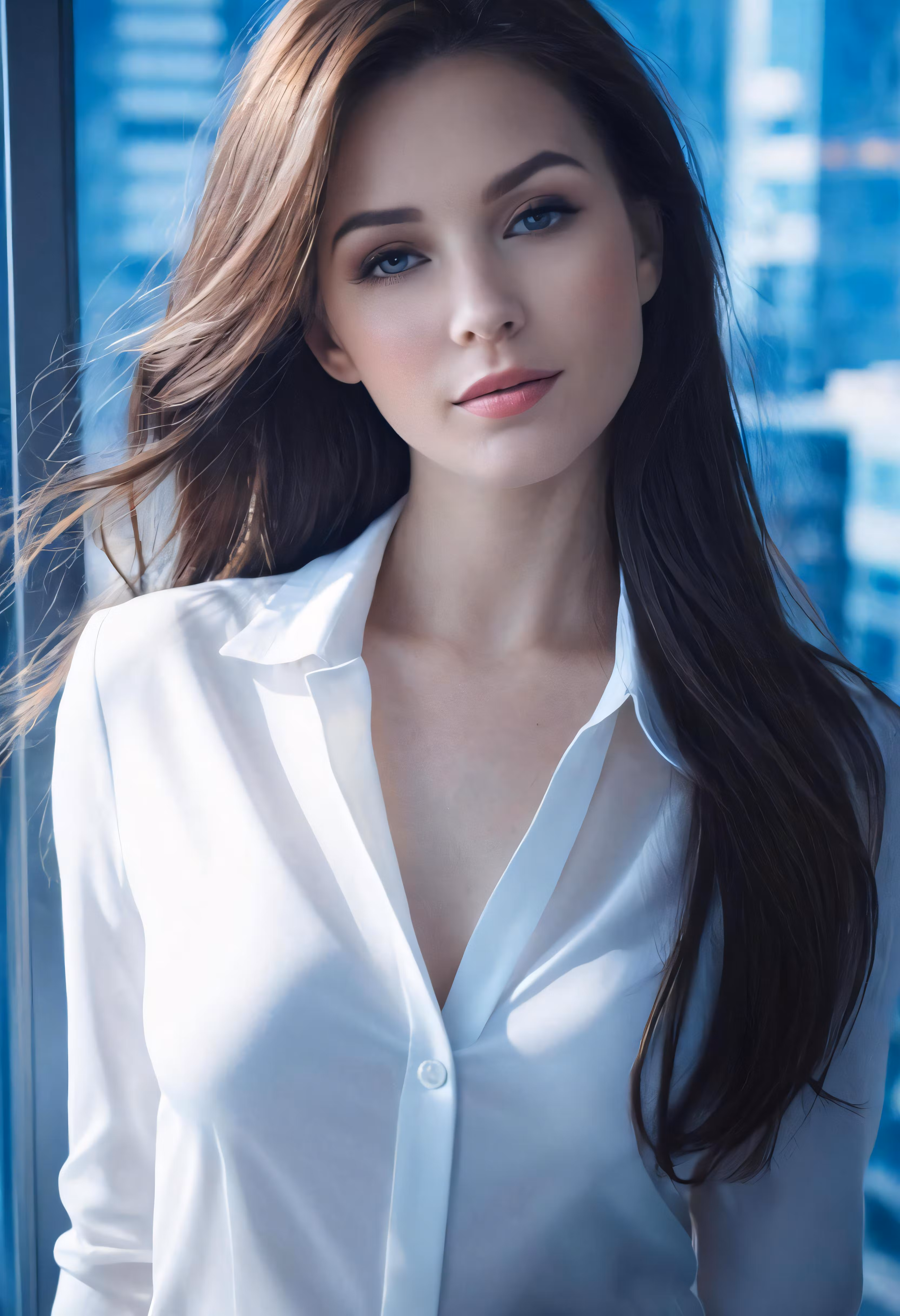 High resolution picture, free to use, a woman posing near a window in a suit and shirt