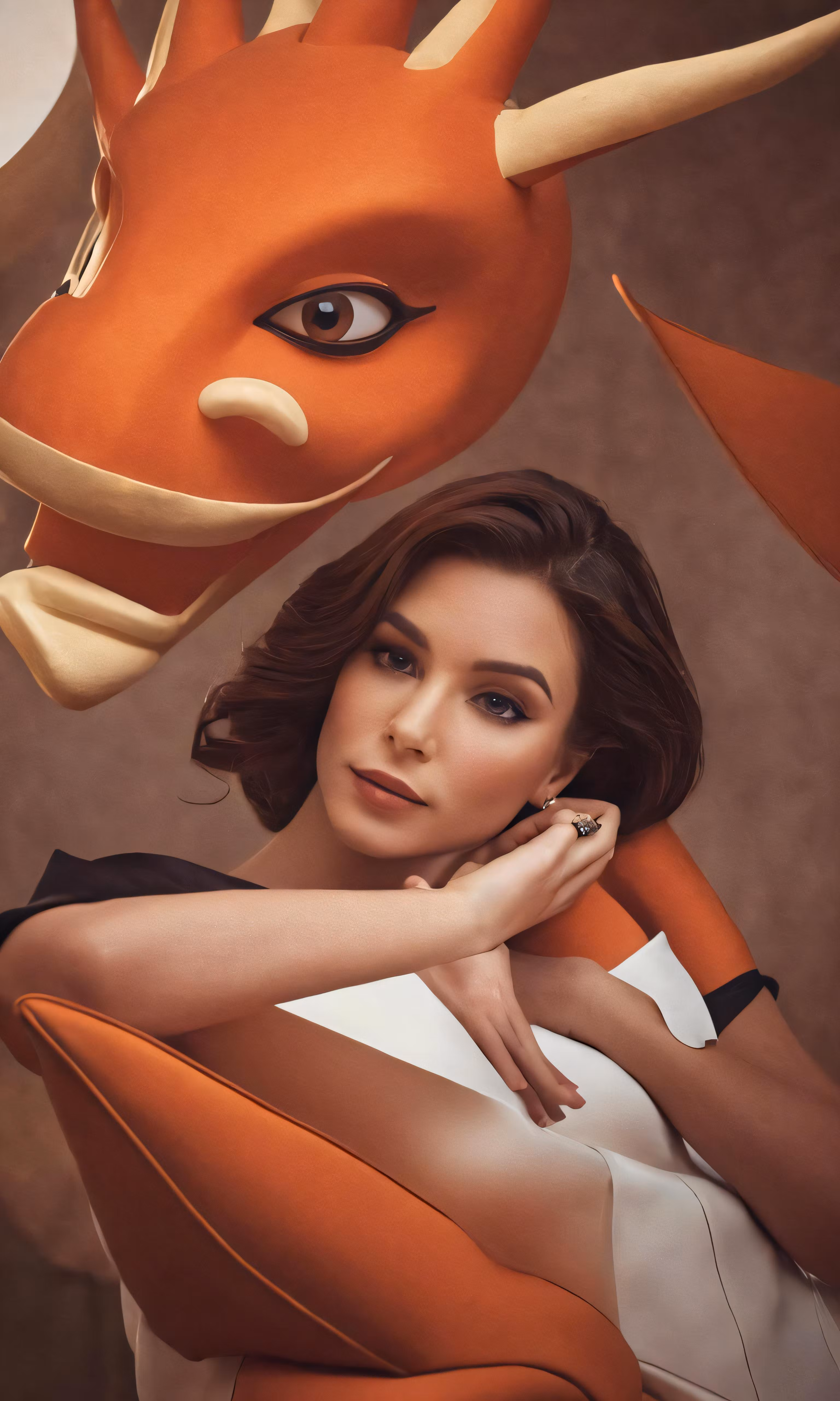 High resolution picture, free to use, a woman posing with an orange dragon mask