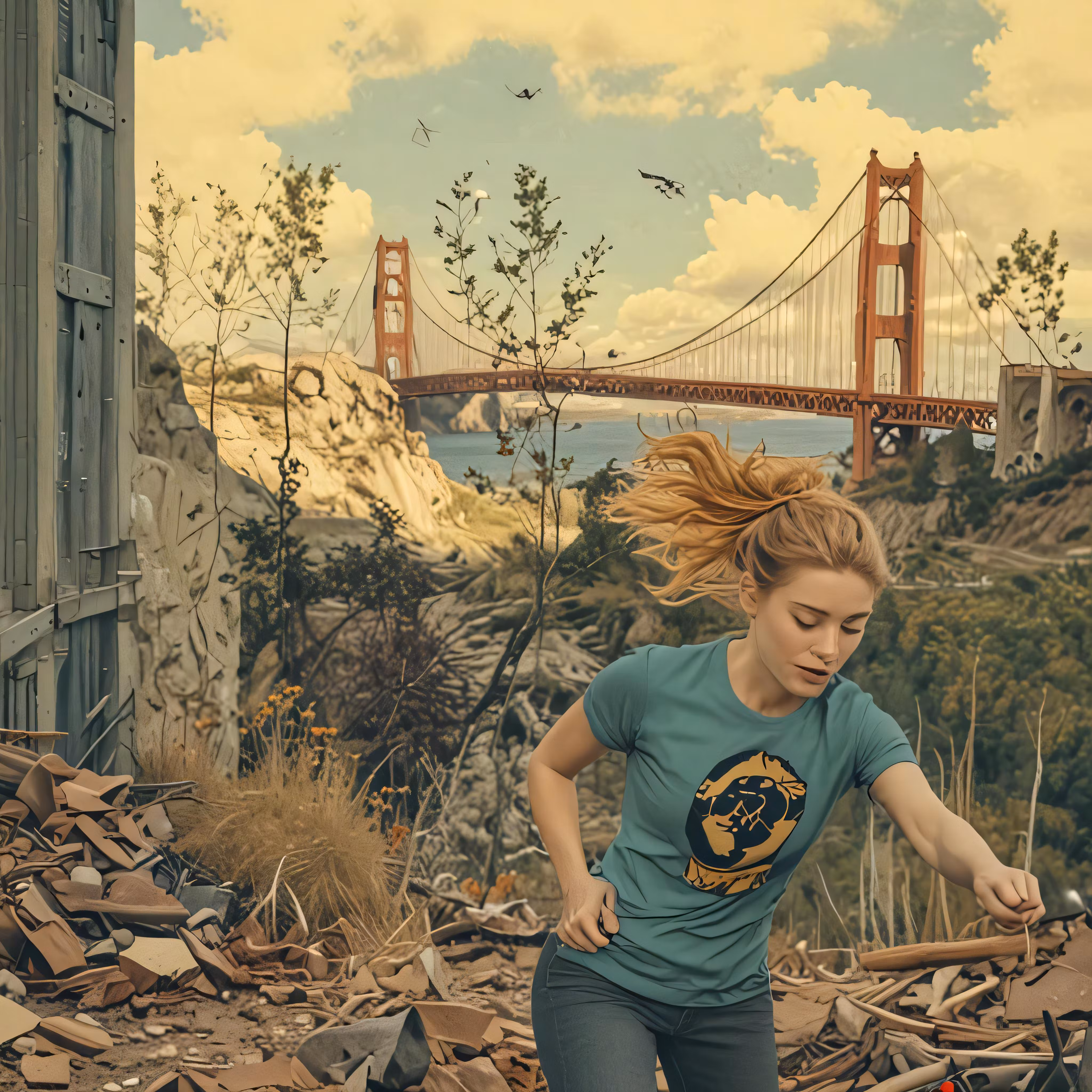 High resolution picture, free to use, a woman running in a pile of rubble near the bridge
