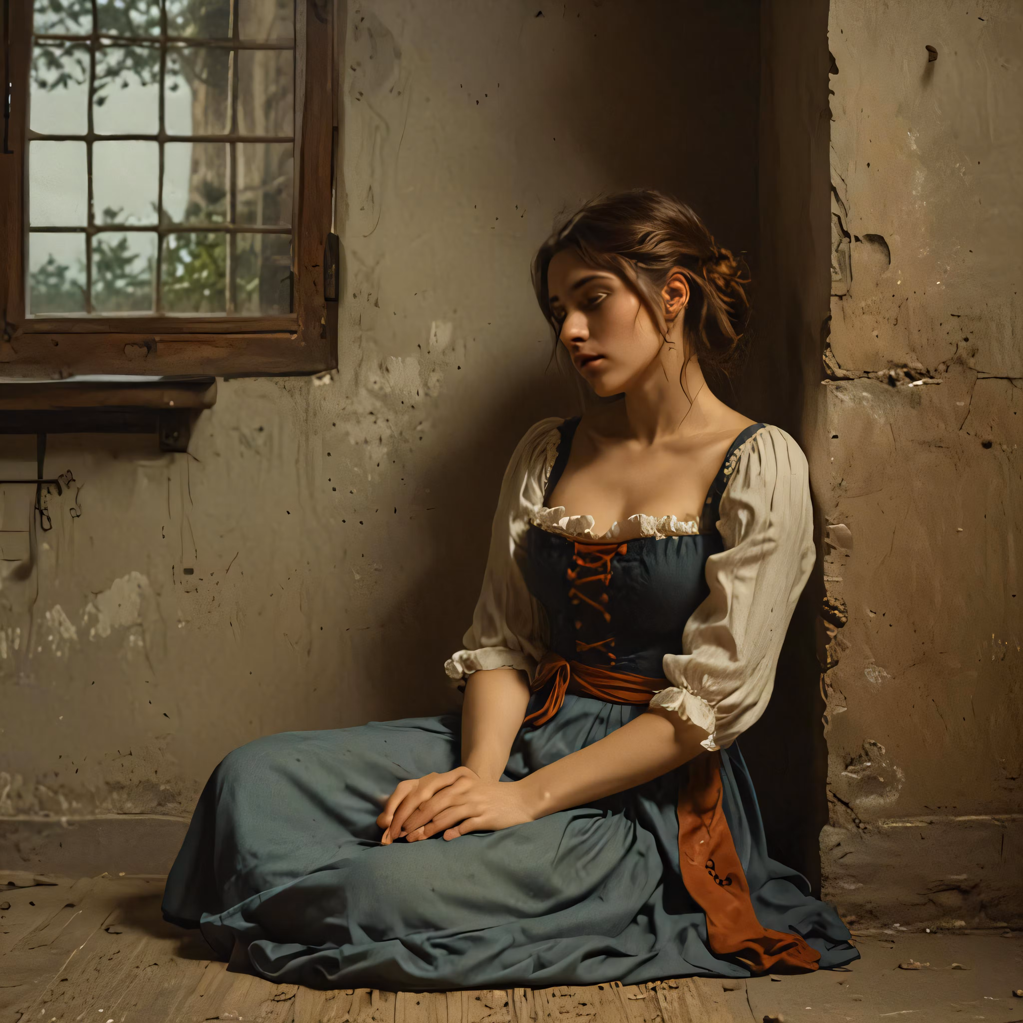 High resolution picture, free to use, a woman sits in the corner of a room by a window