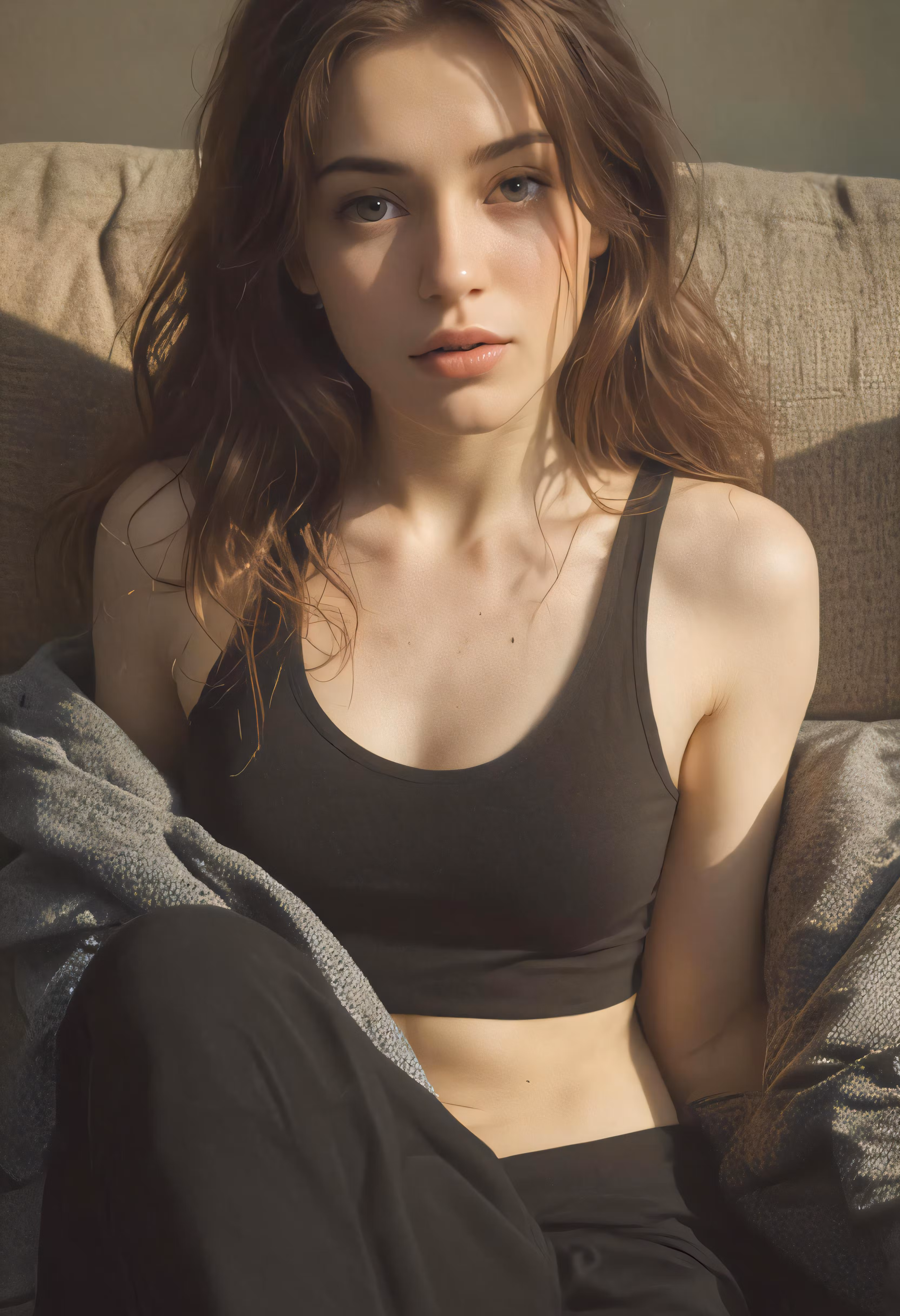 High resolution picture, free to use, a woman sits on the couch in her underwear
