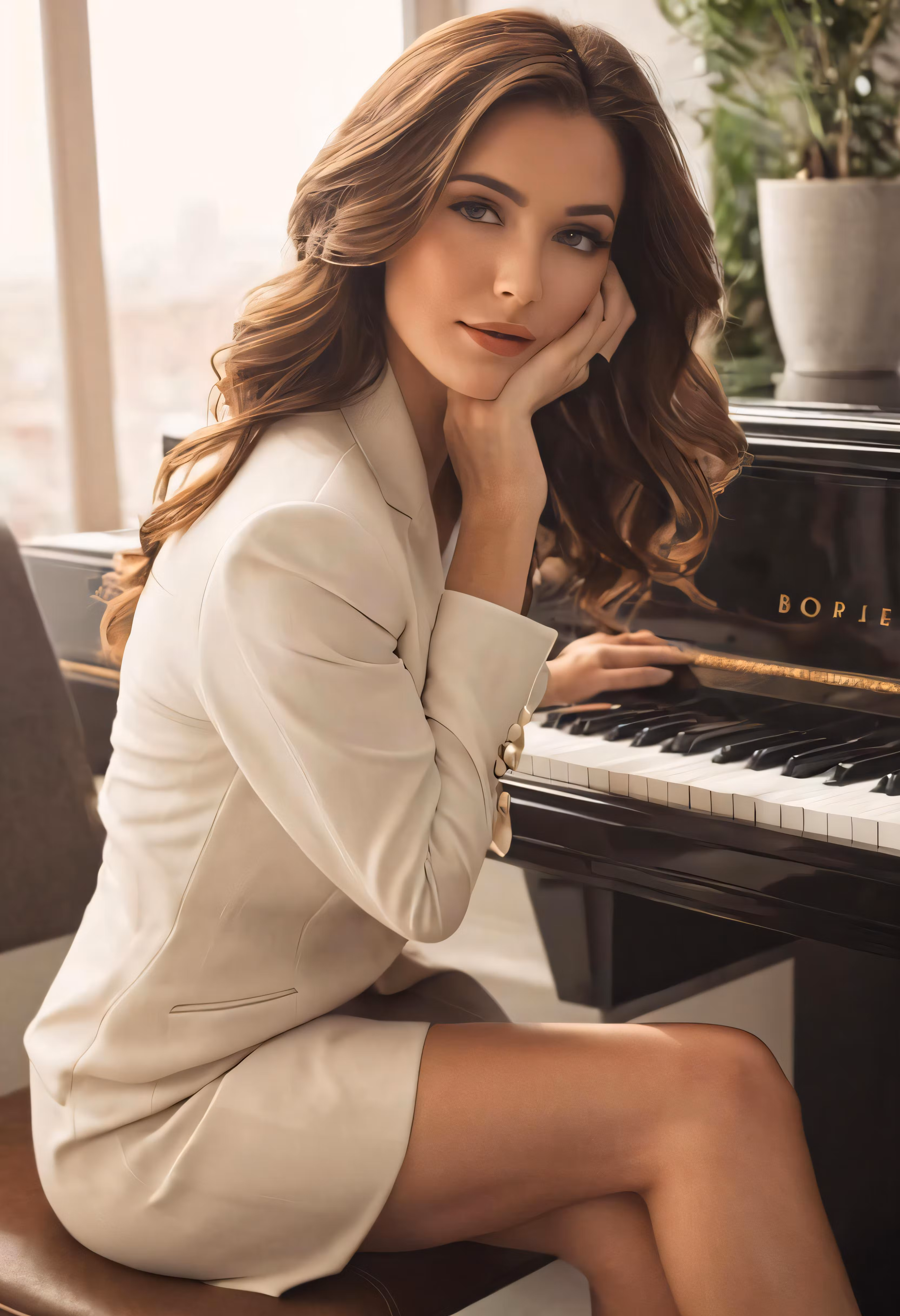 High resolution picture, free to use, a woman sitting at a piano wearing a suit