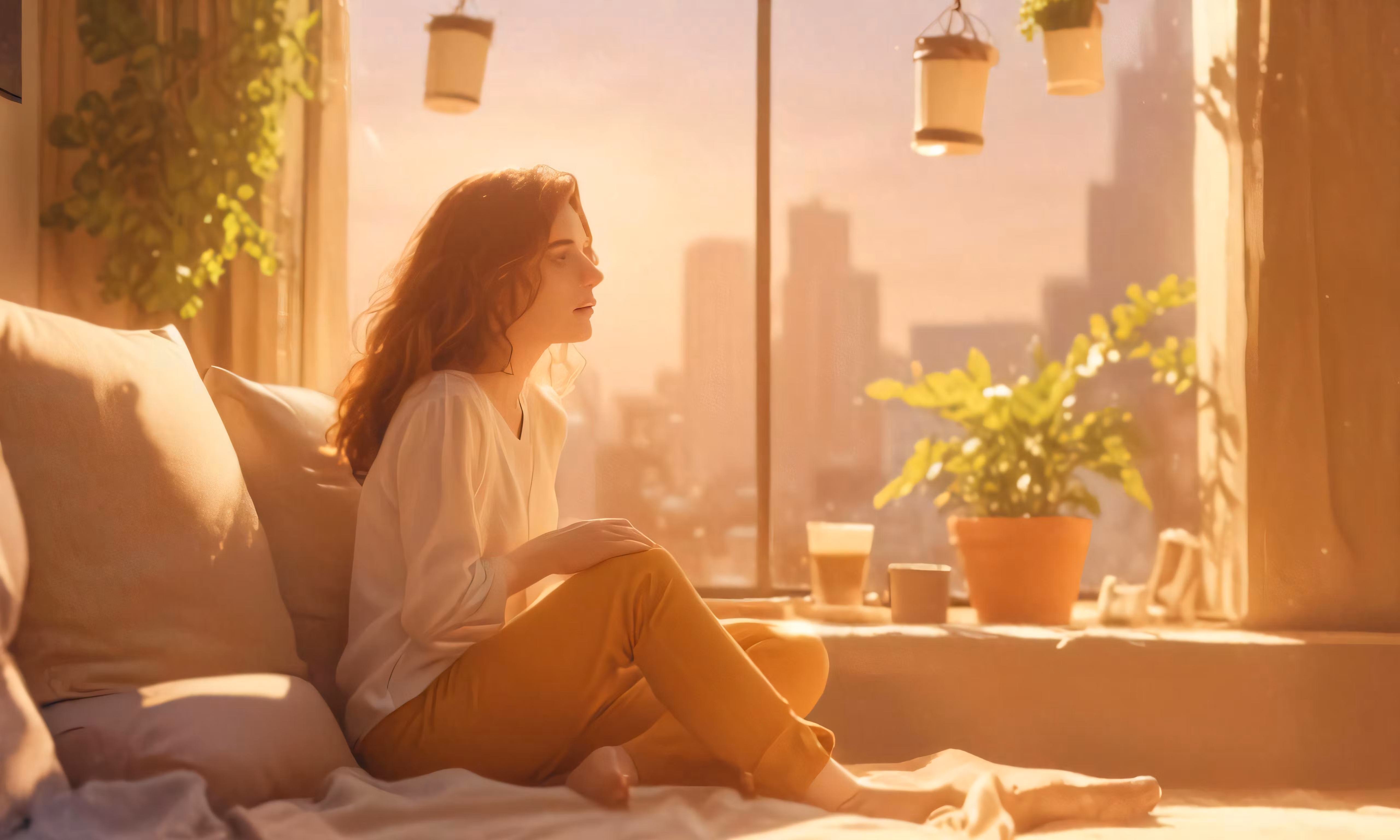 High resolution picture, free to use, a woman sitting on a bed with a window open looking out at the city