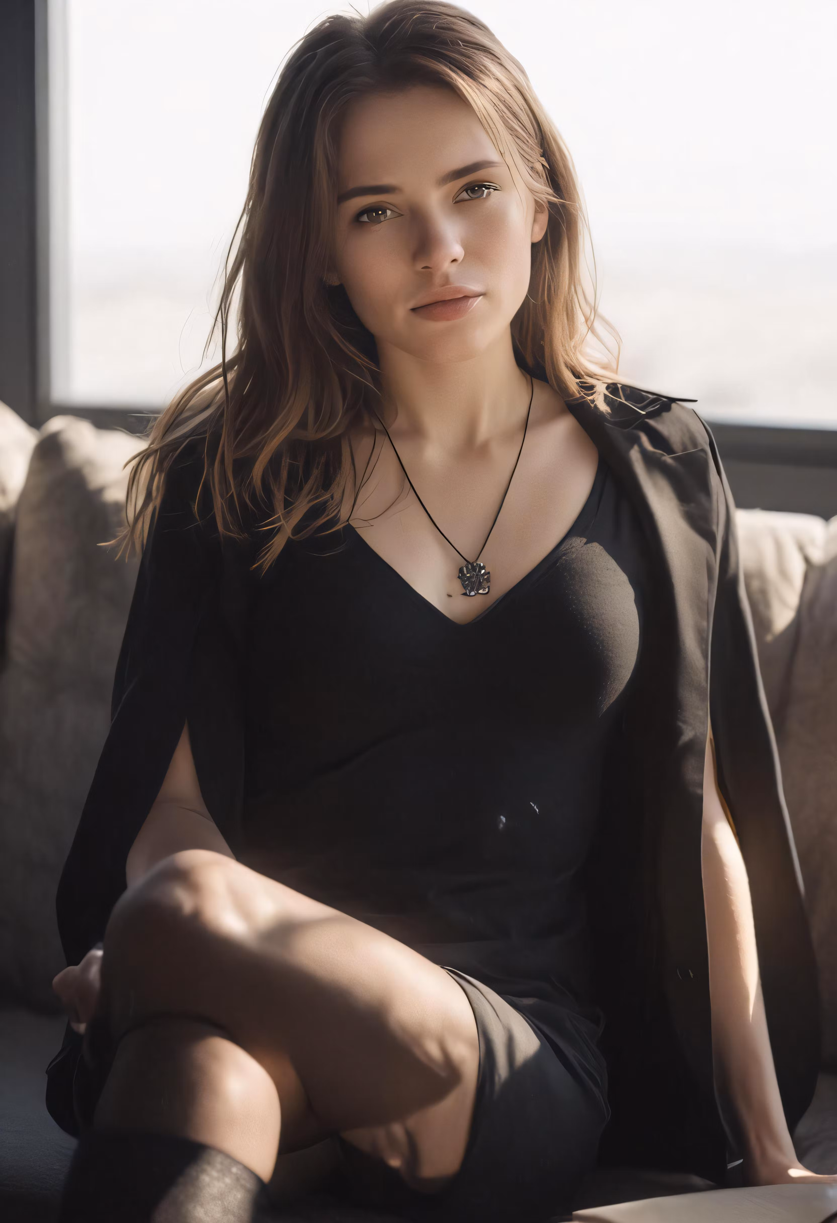 High resolution picture, free to use, a woman sitting on a couch with a necklace on