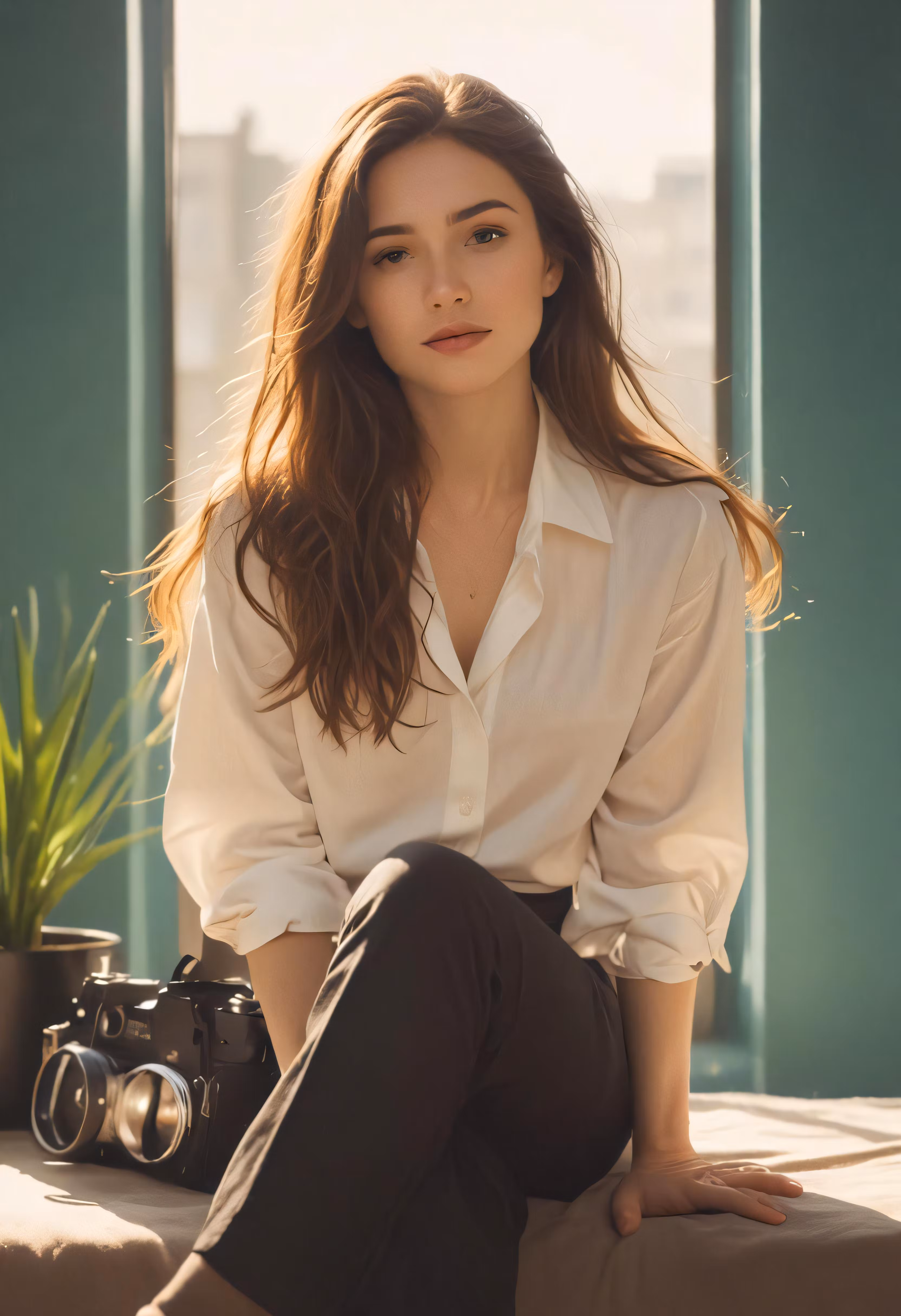 High resolution picture, free to use, a woman sitting on a wall with her camera in front of her