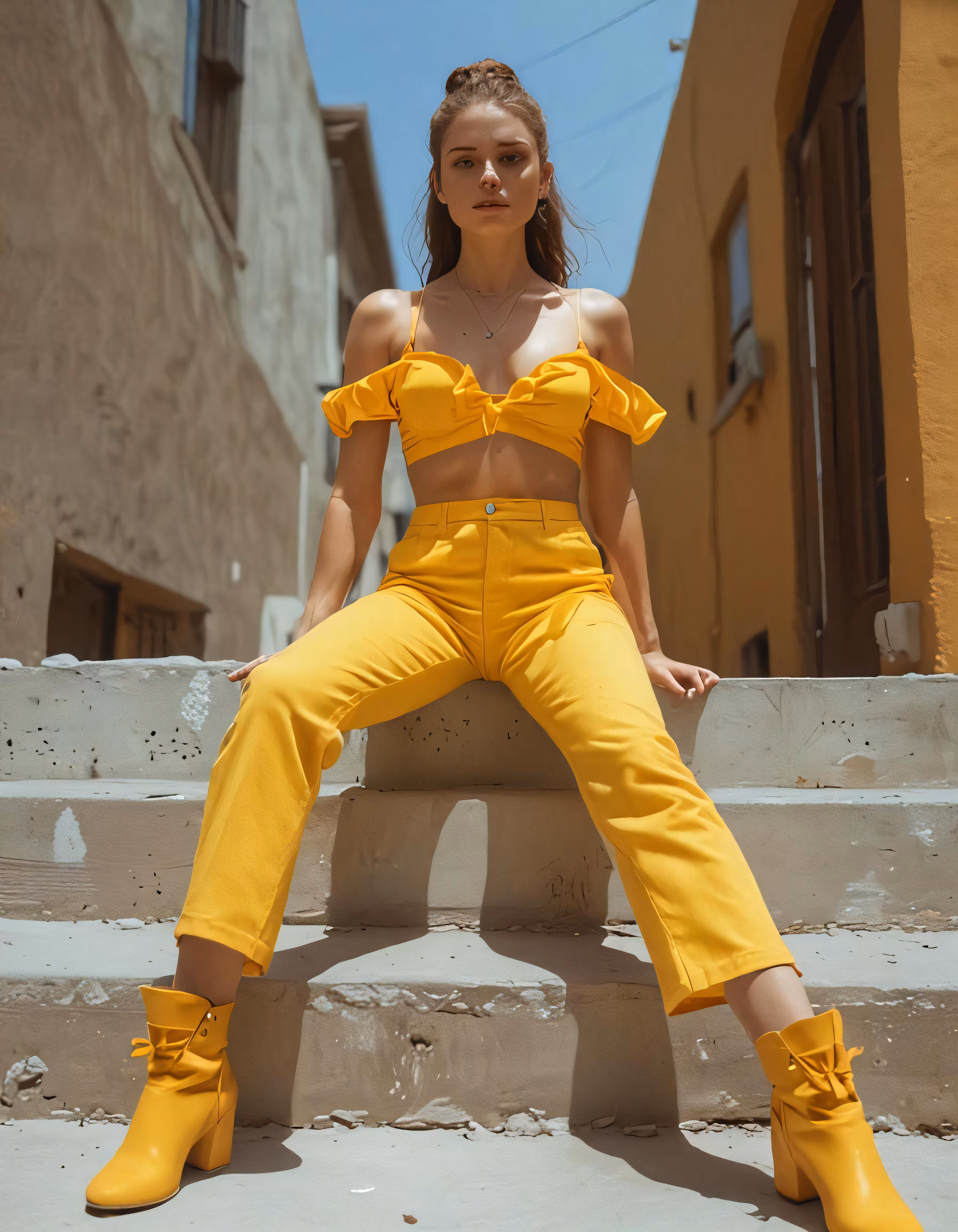 High resolution picture, free to use, a woman sitting on the steps with her legs spread down wearing yellow