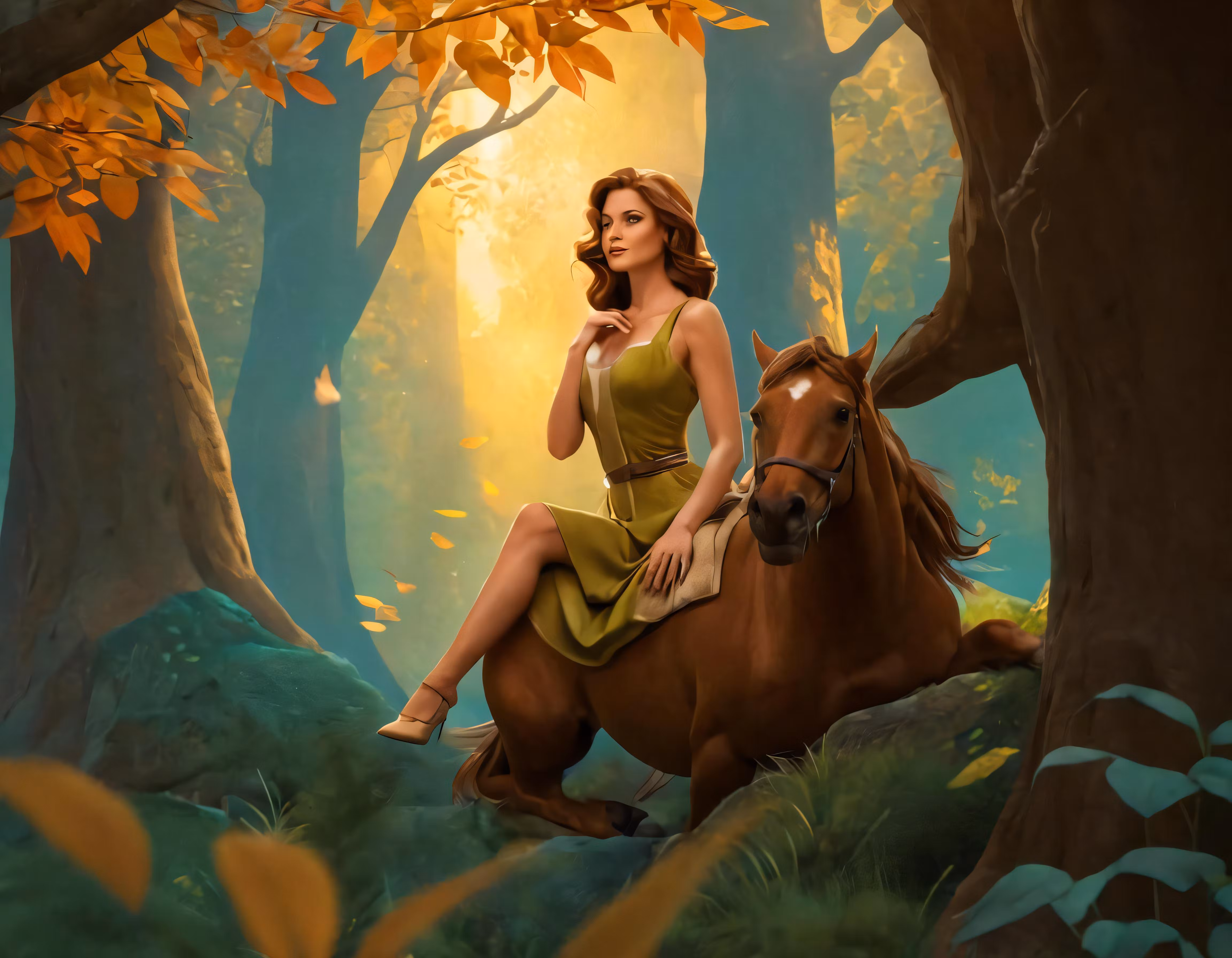 High resolution picture, free to use, a woman sitting on top of a brown horse in the forest
