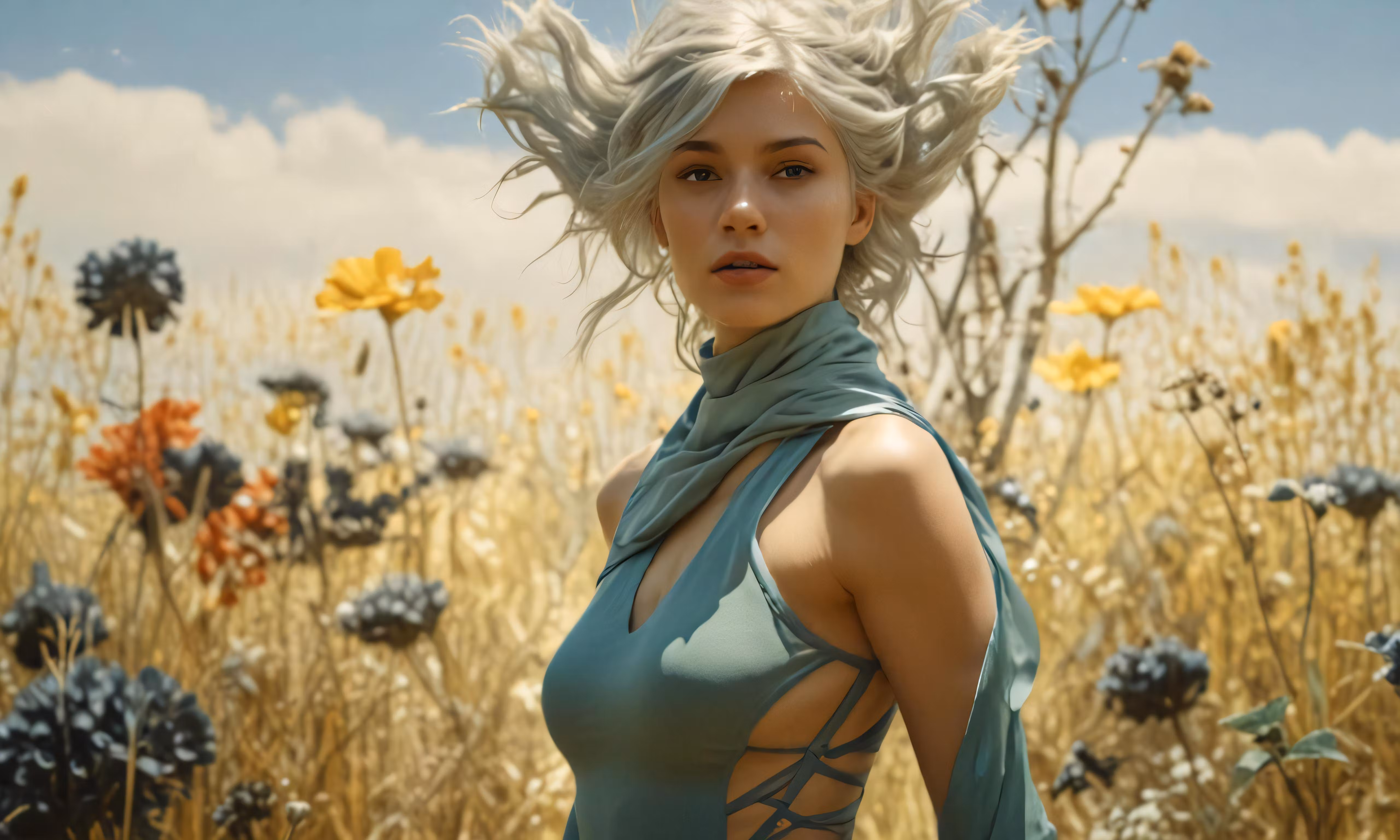 High resolution picture, free to use, a woman standing in a flowery field with an unimposed head