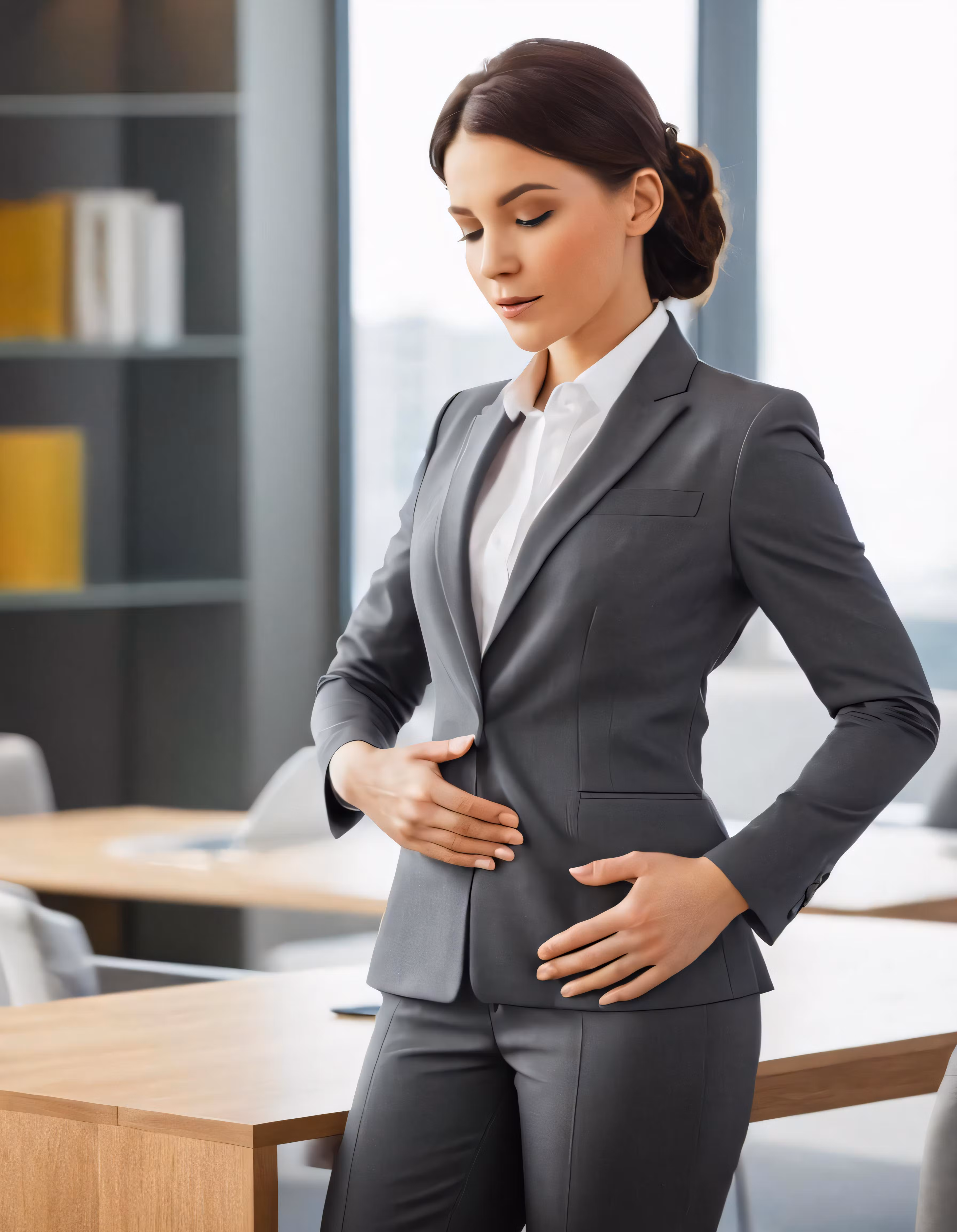 High resolution picture, free to use, a woman standing in an office with her hand on her stomach