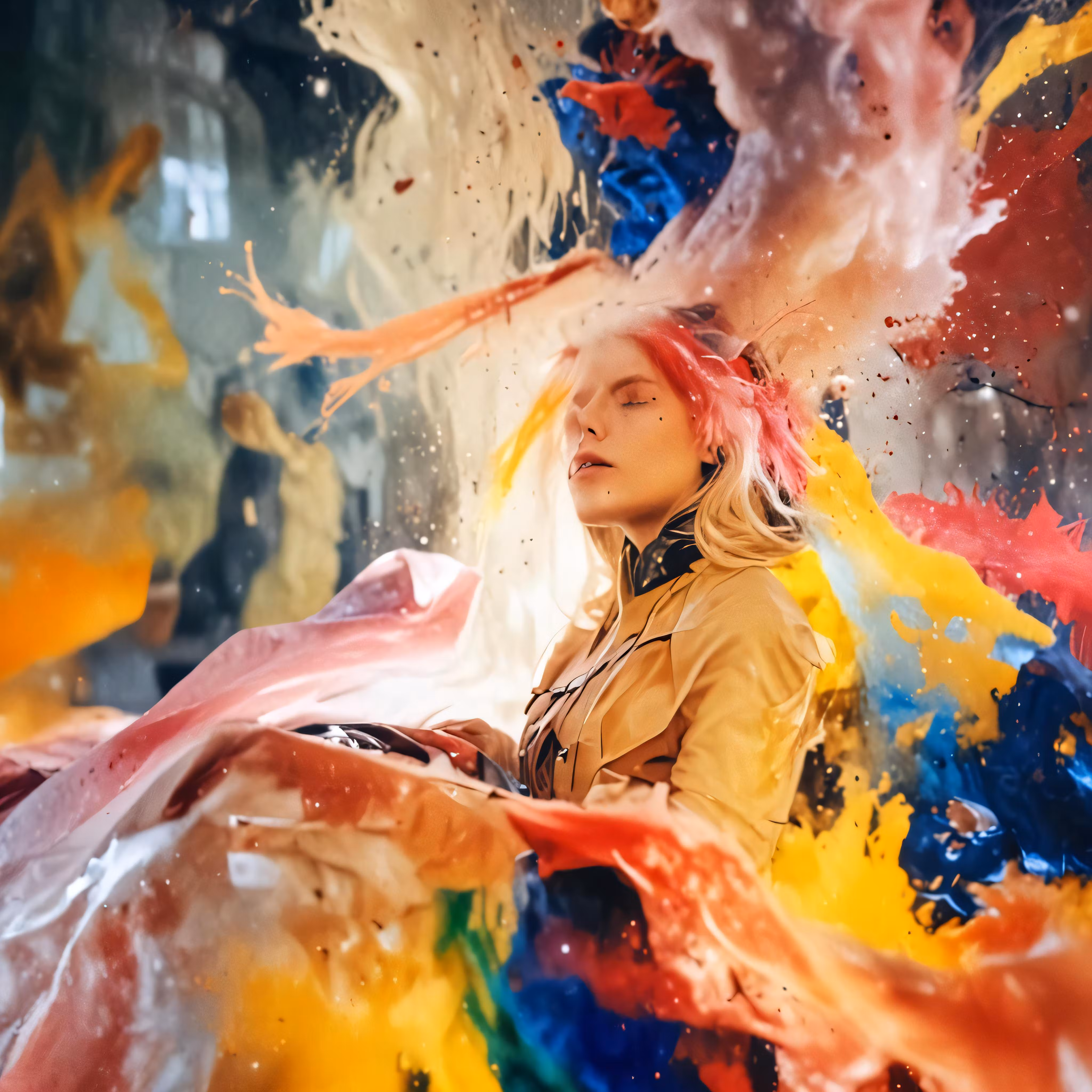 High resolution picture, free to use, a woman standing in front of a colorful wall