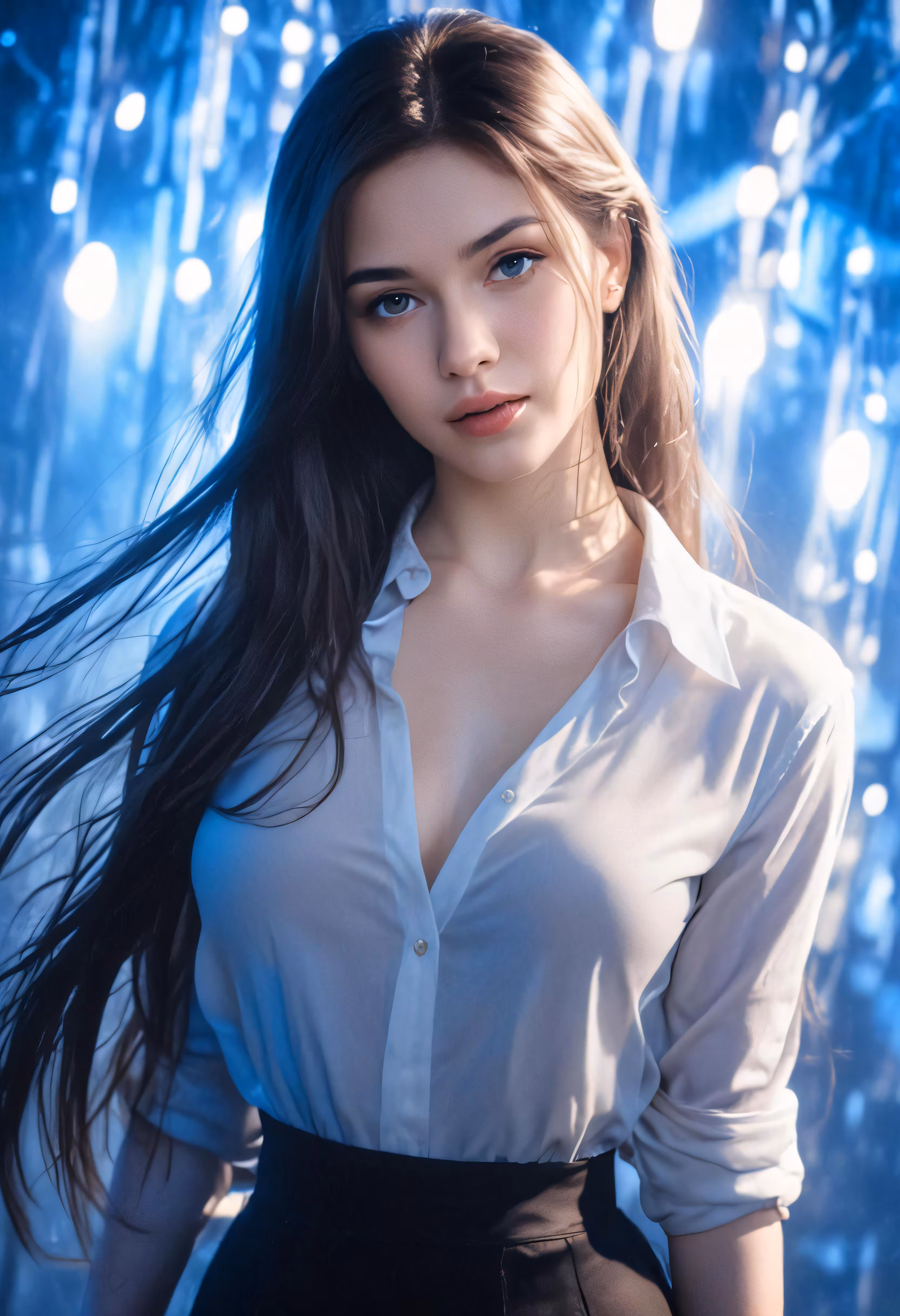 High resolution picture, free to use, a woman standing in front of lights, wearing a white shirt and black shorts