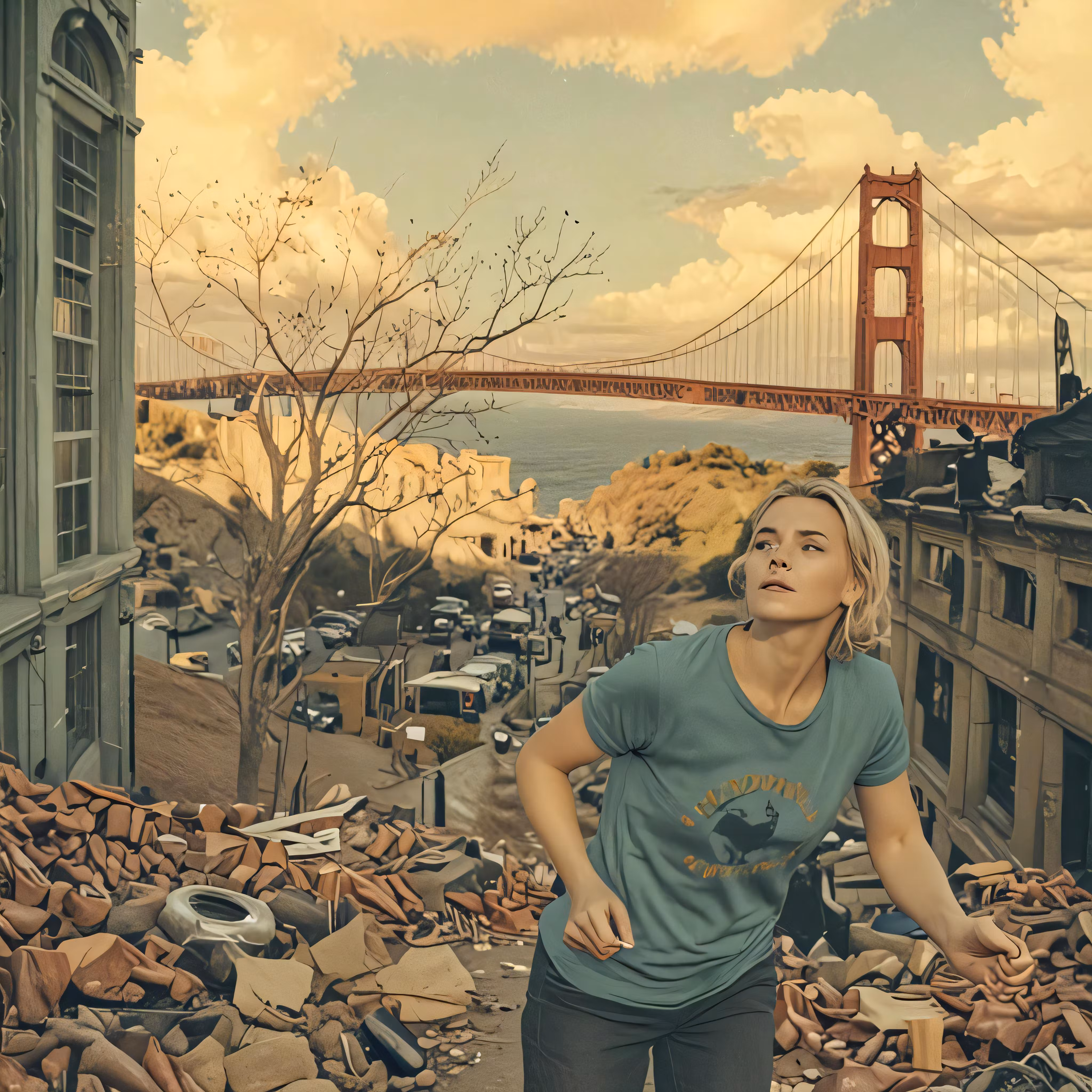 High resolution picture, free to use, a woman standing in the rubble of a city under the golden gate bridge