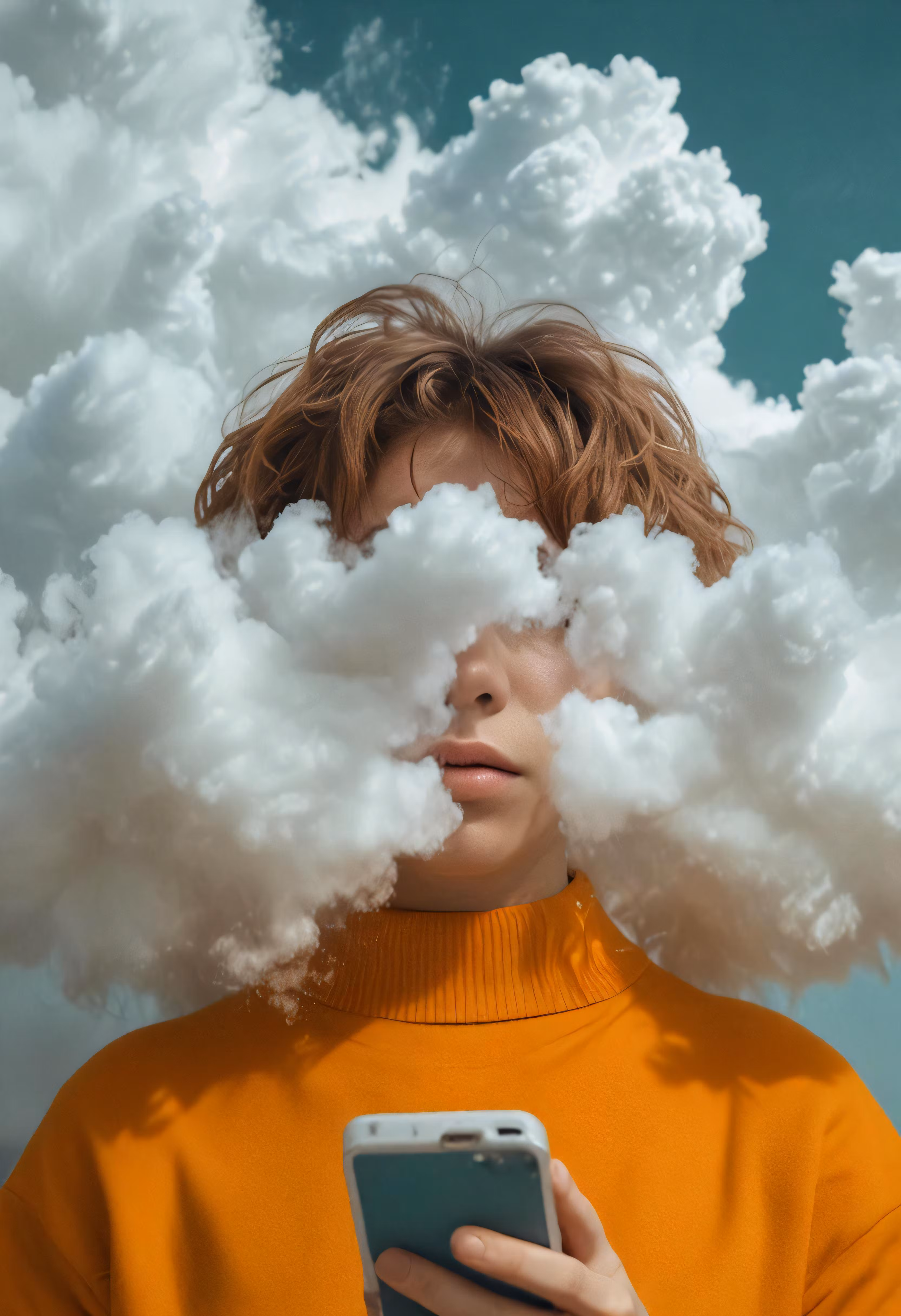 High resolution picture, free to use, a woman standing under the clouds looking at her phone