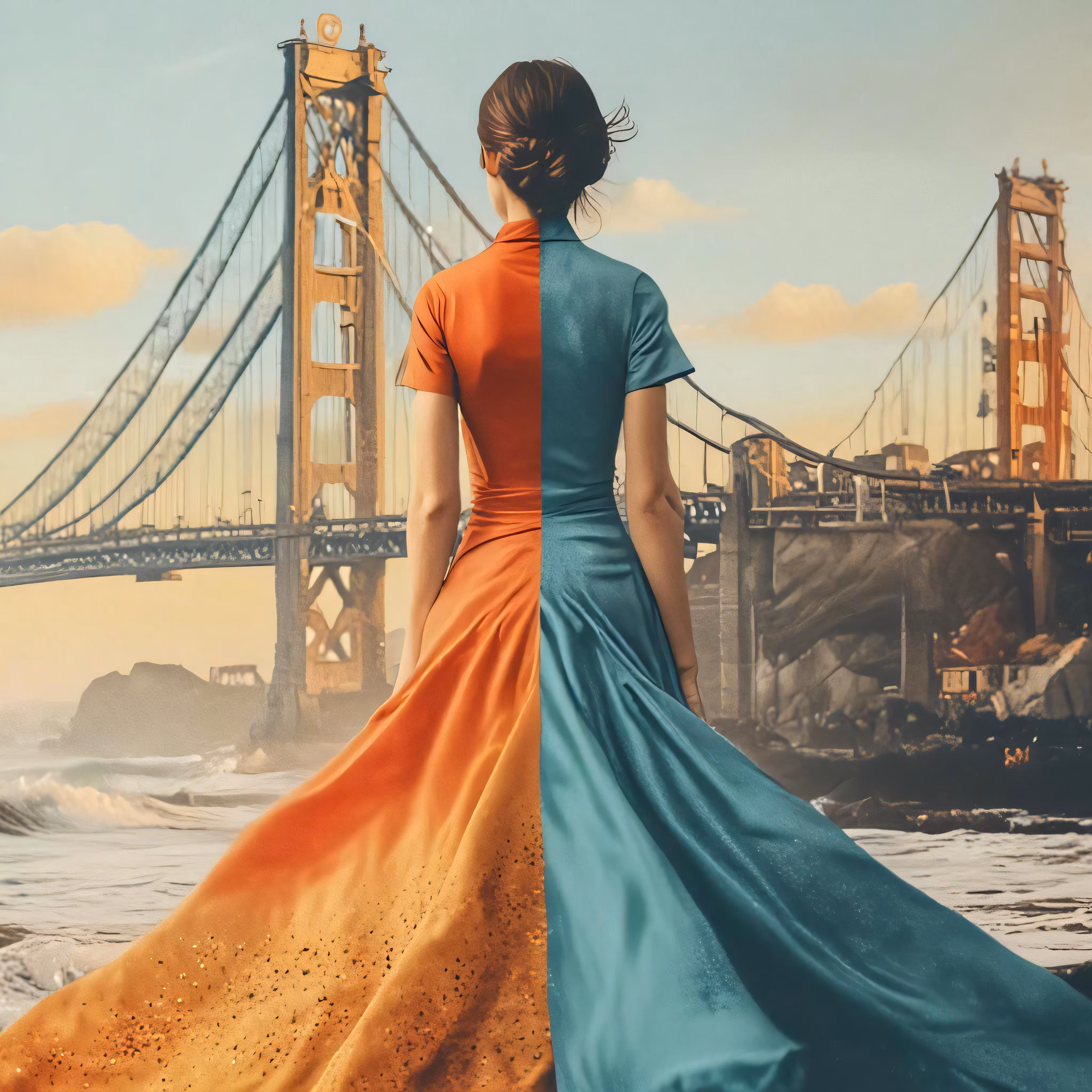 High resolution picture, free to use, a woman stands alone in front of the golden gate bridge