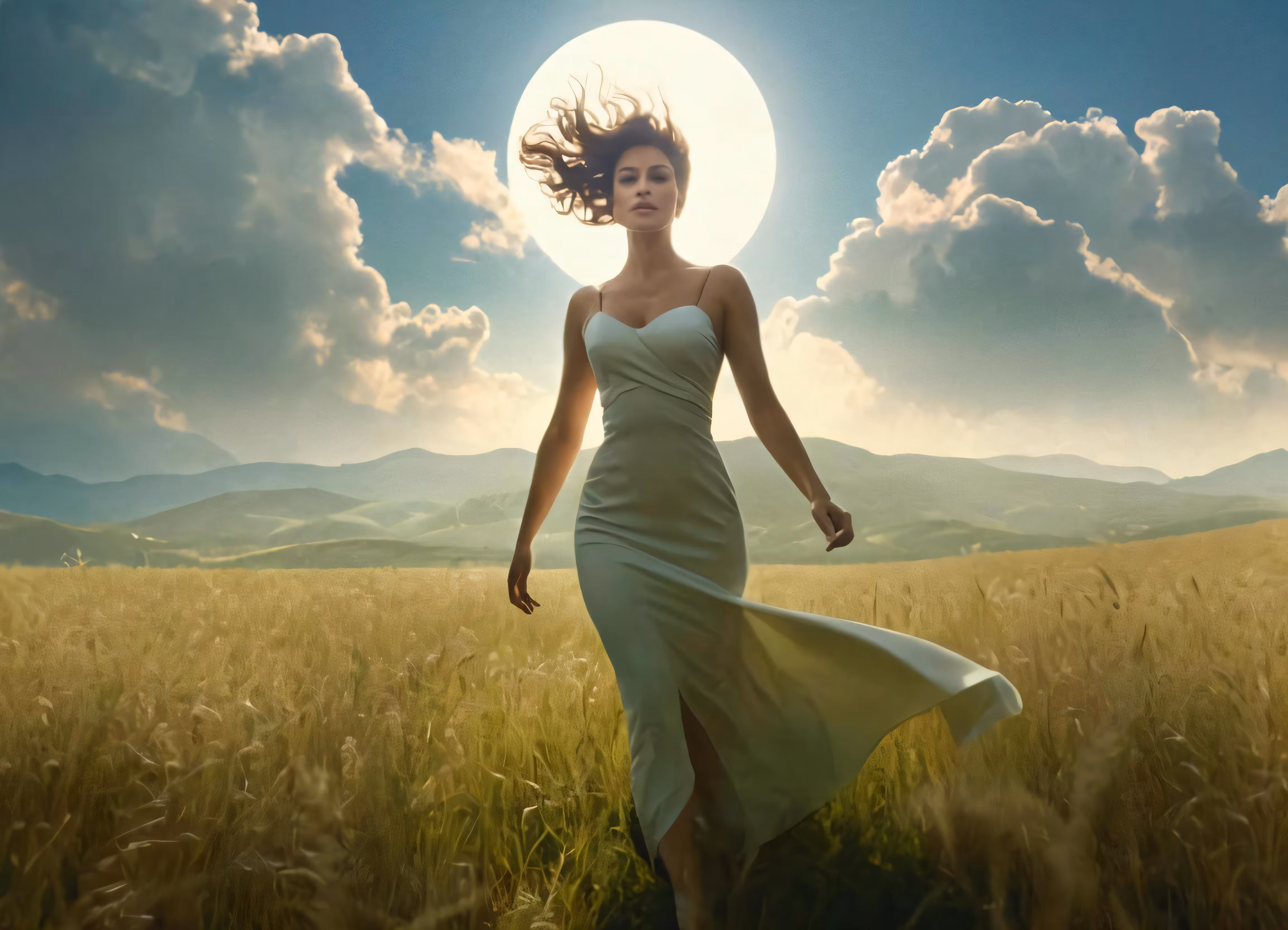 High resolution picture, free to use, a woman walking through a field with her hair in the wind