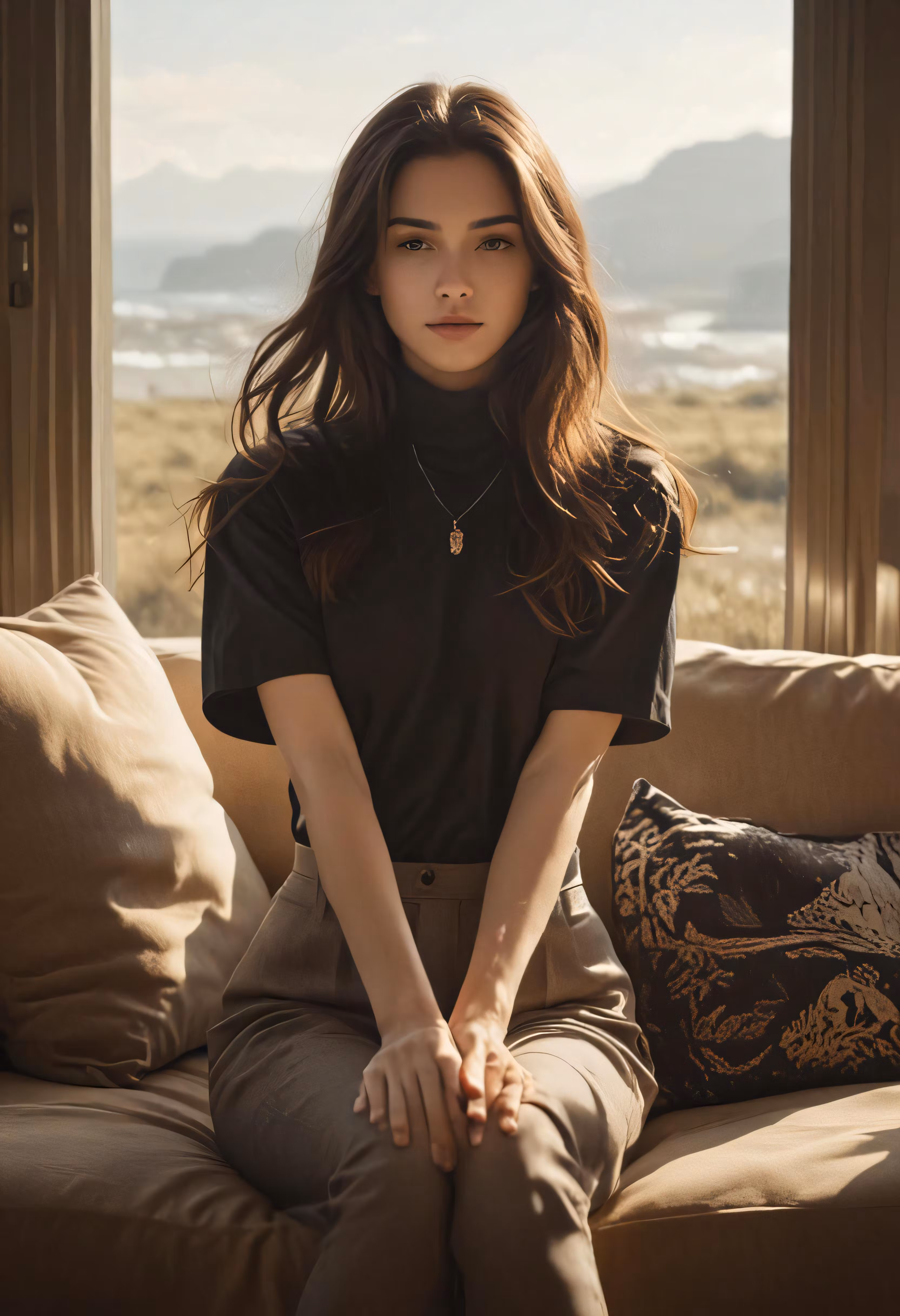 High resolution picture, free to use, a woman wearing a black shirt sits on a tan couch