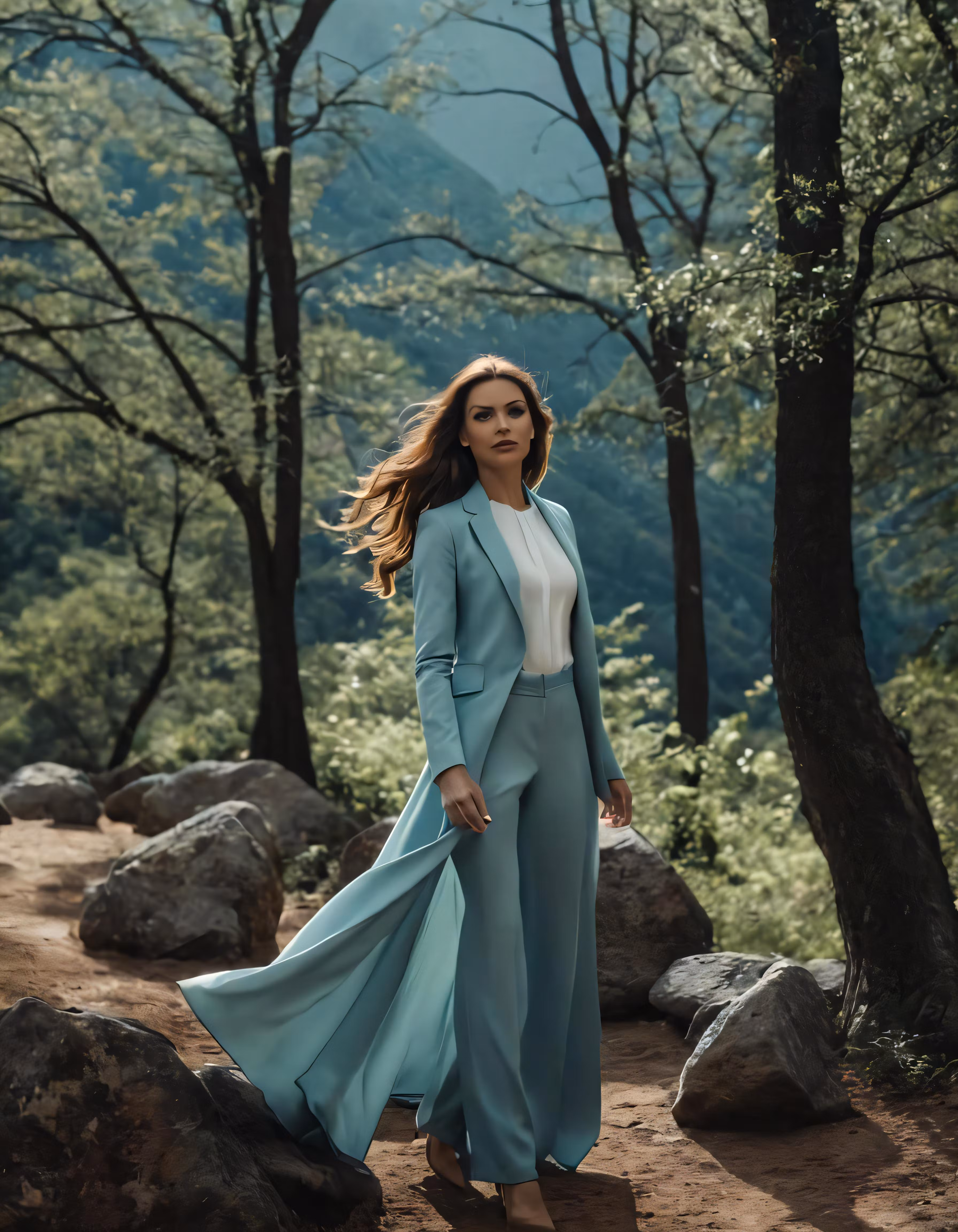 High resolution picture, free to use, a woman wearing a blue suit is posing in the woods