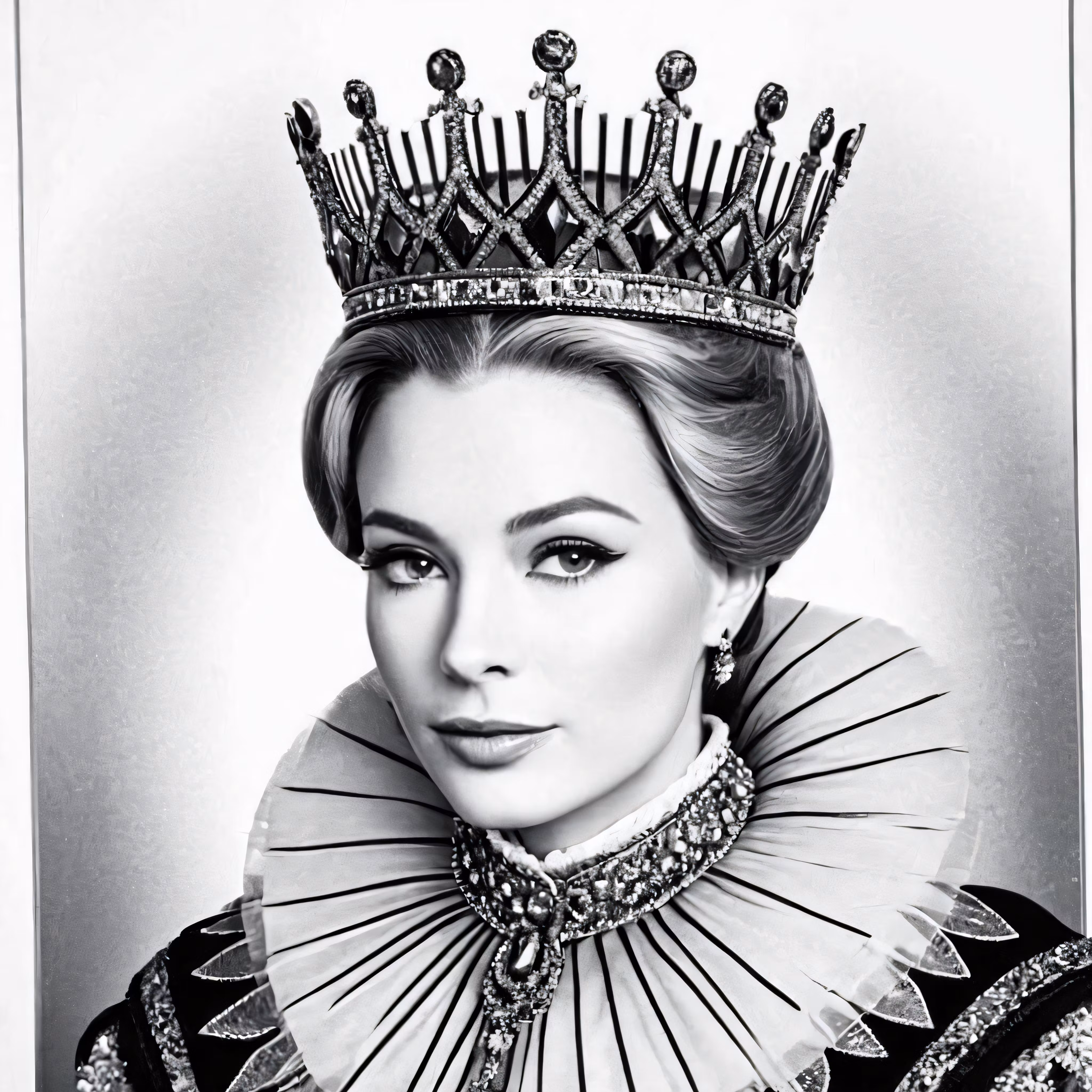 High resolution picture, free to use, a woman wearing a crown and sitting on a chair