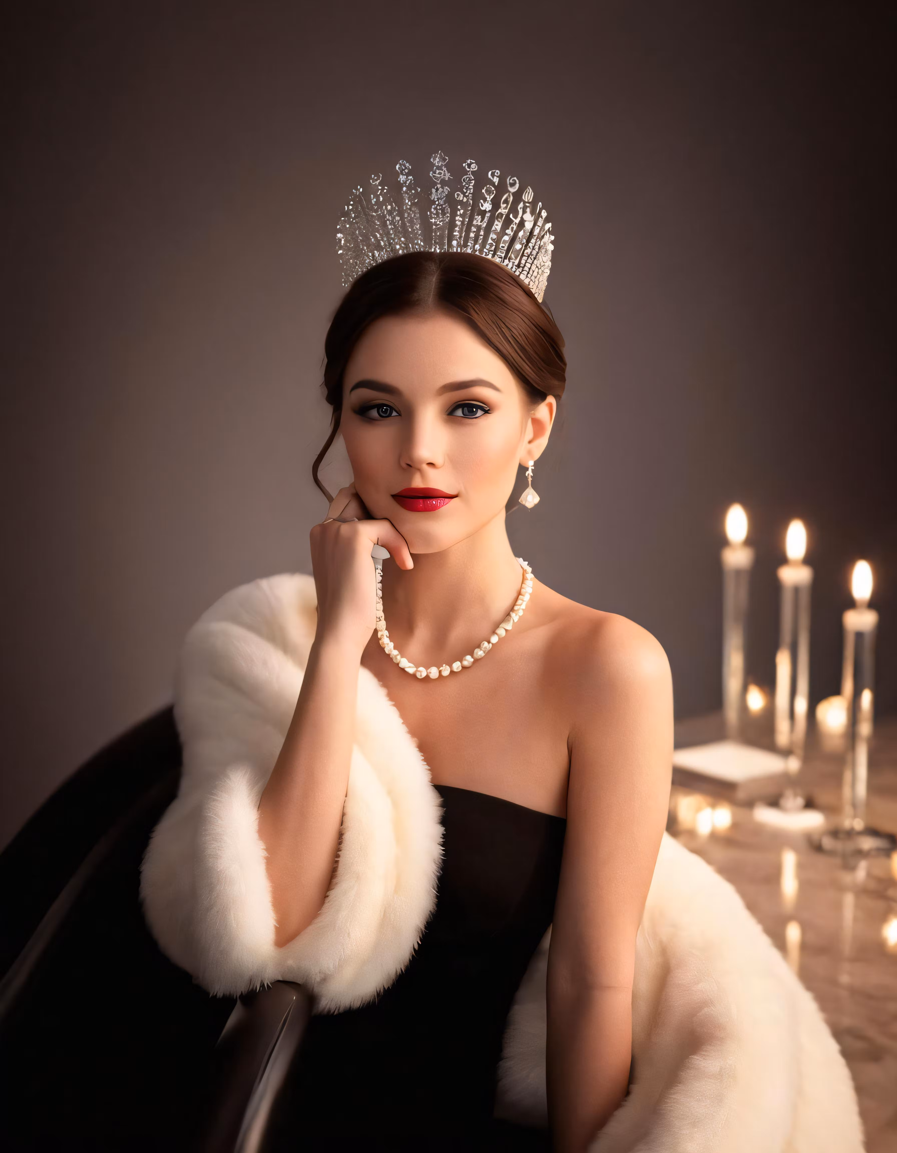 High resolution picture, free to use, a woman wearing a crown sits at a table