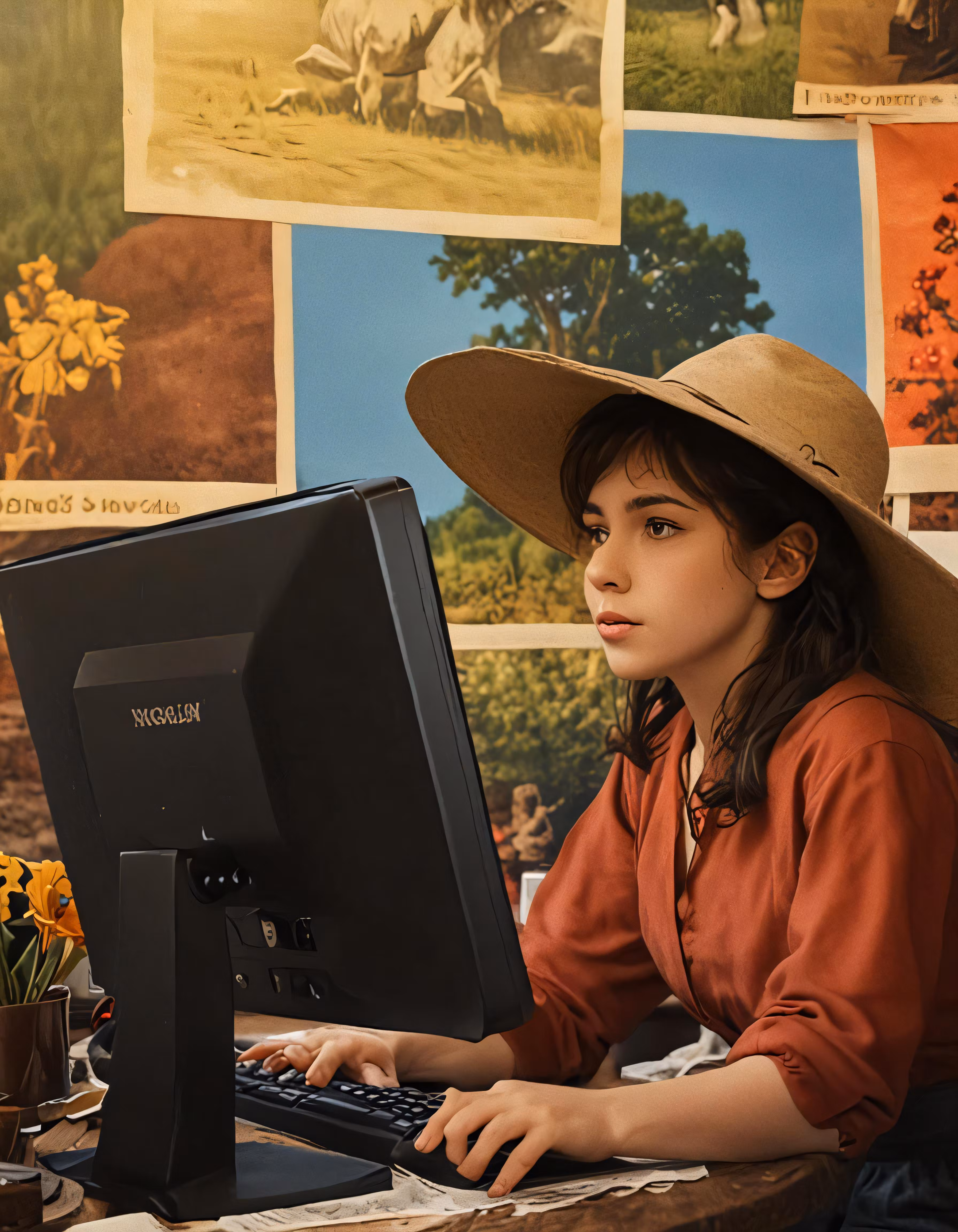 High resolution picture, free to use, a woman wearing a floppy hat and working on her computer