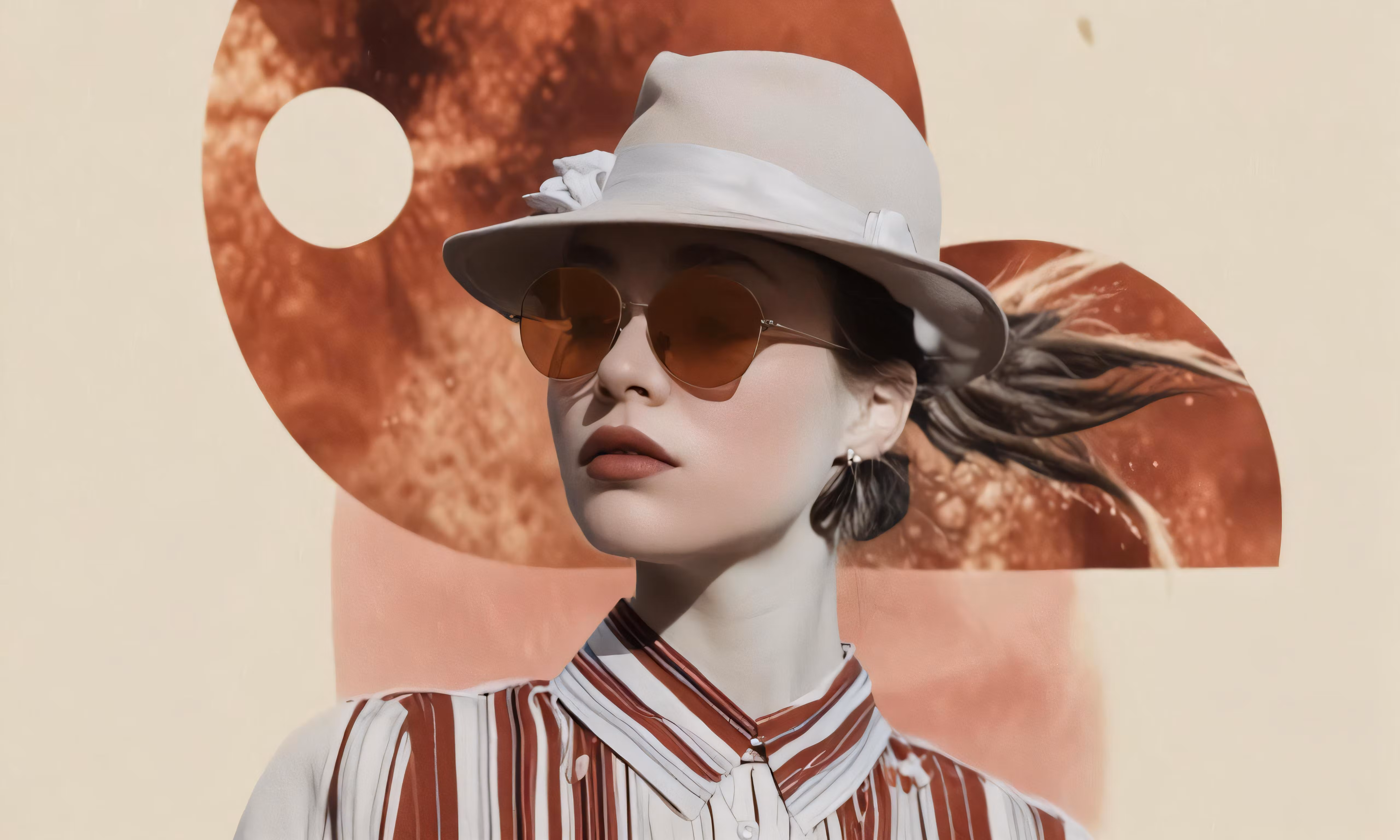 High resolution picture, free to use, a woman wearing a hat and sunglasses with a large circle of oranges behind her