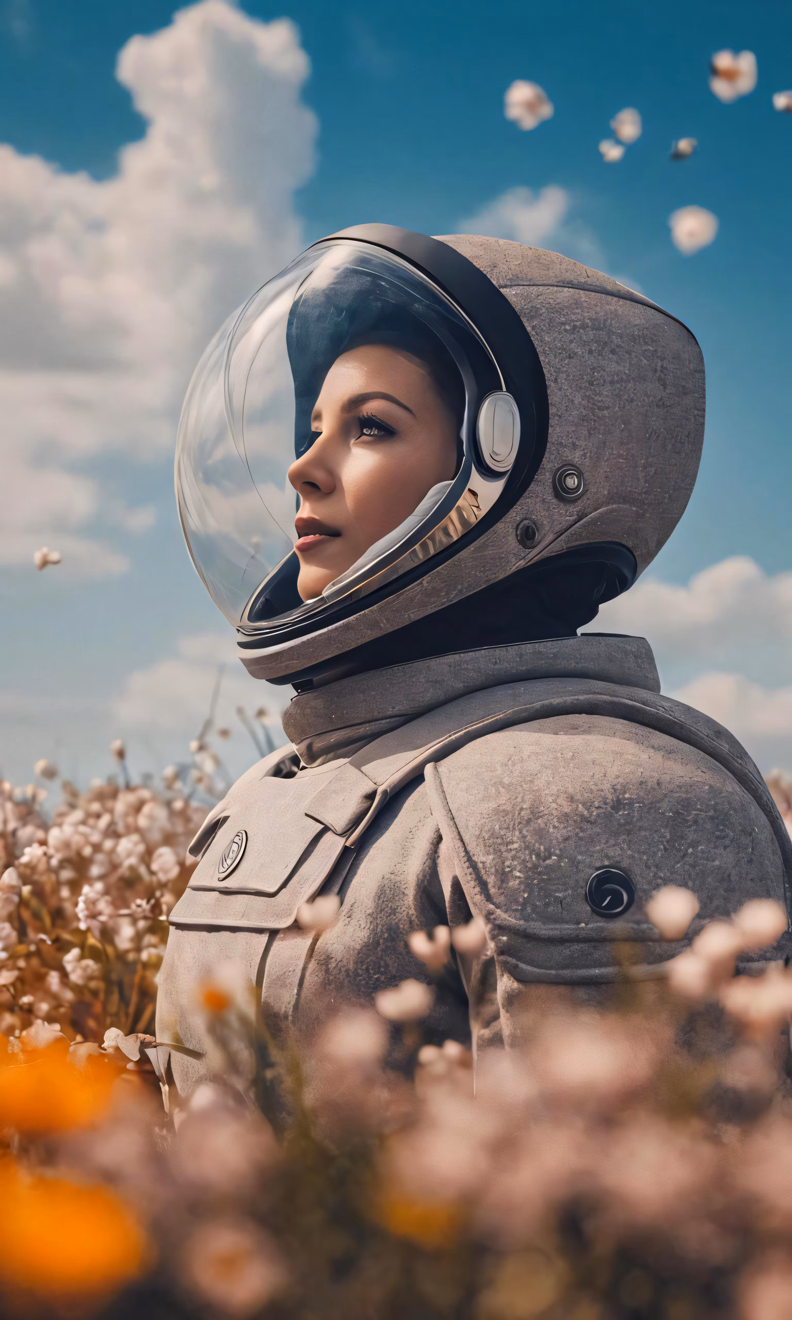 High resolution picture, free to use, a woman wearing a helmet and looking into the distance in a field with many wildflowers