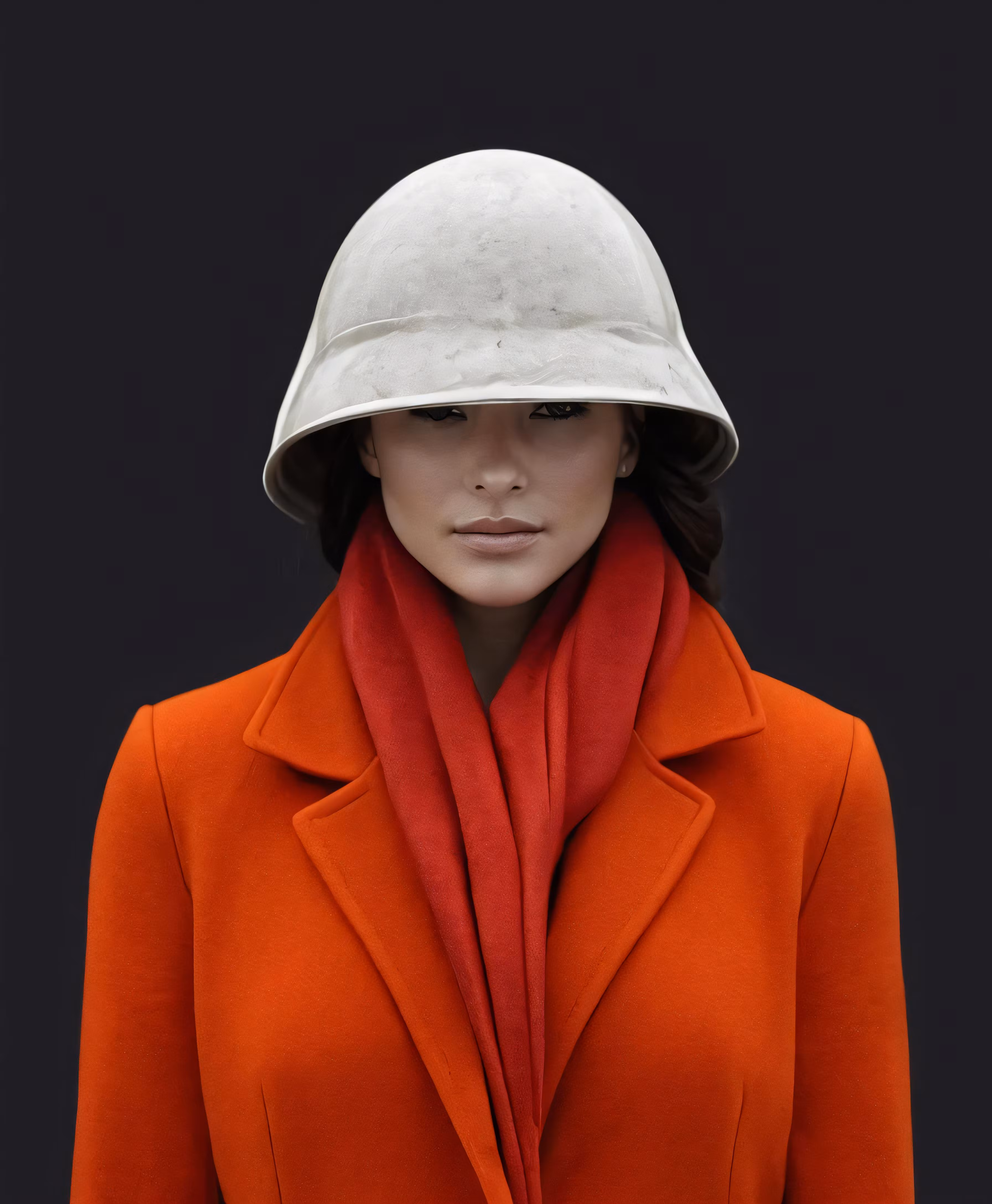 High resolution picture, free to use, a woman wearing a helmet and orange coat