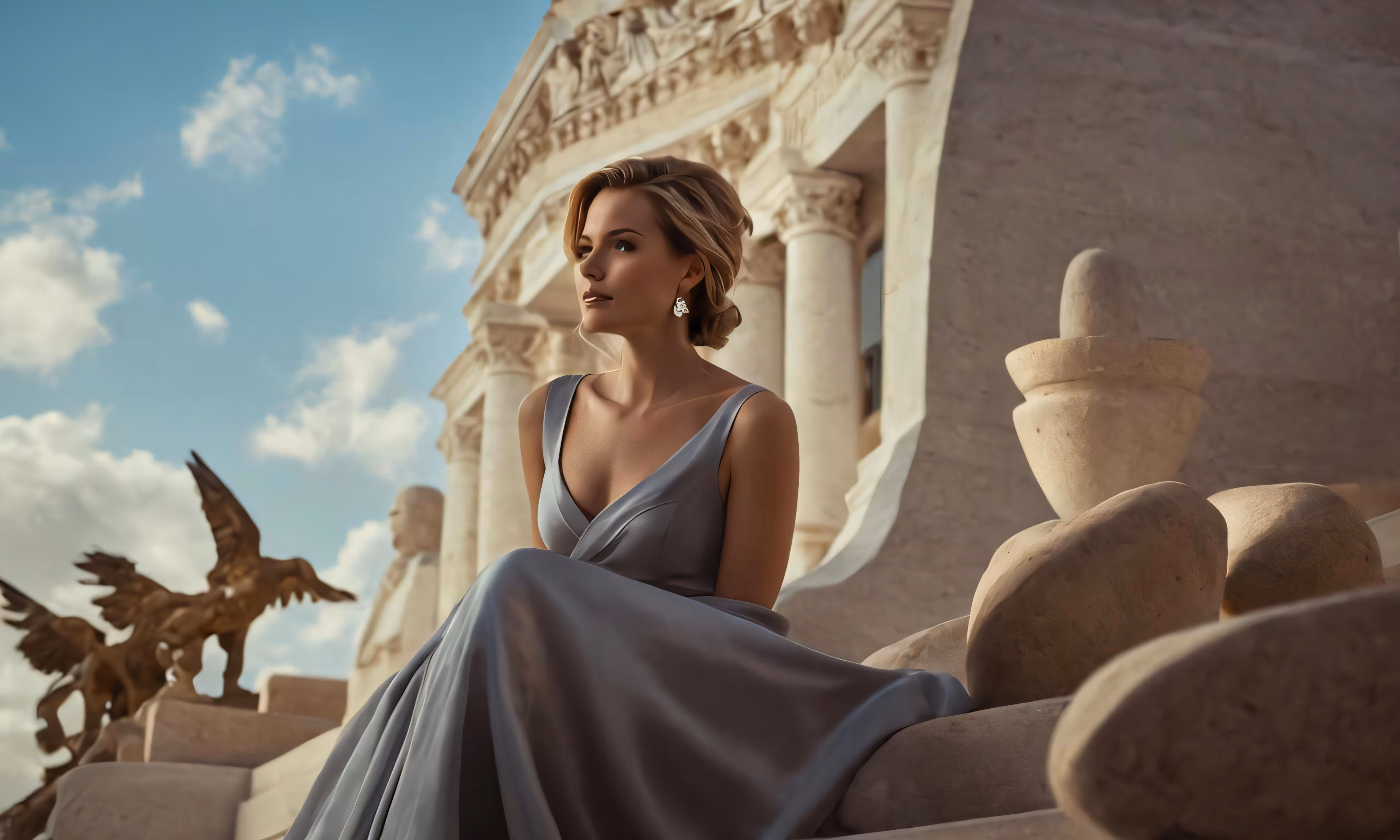 High resolution picture, free to use, a woman wearing a long dress in front of ancient sculptures