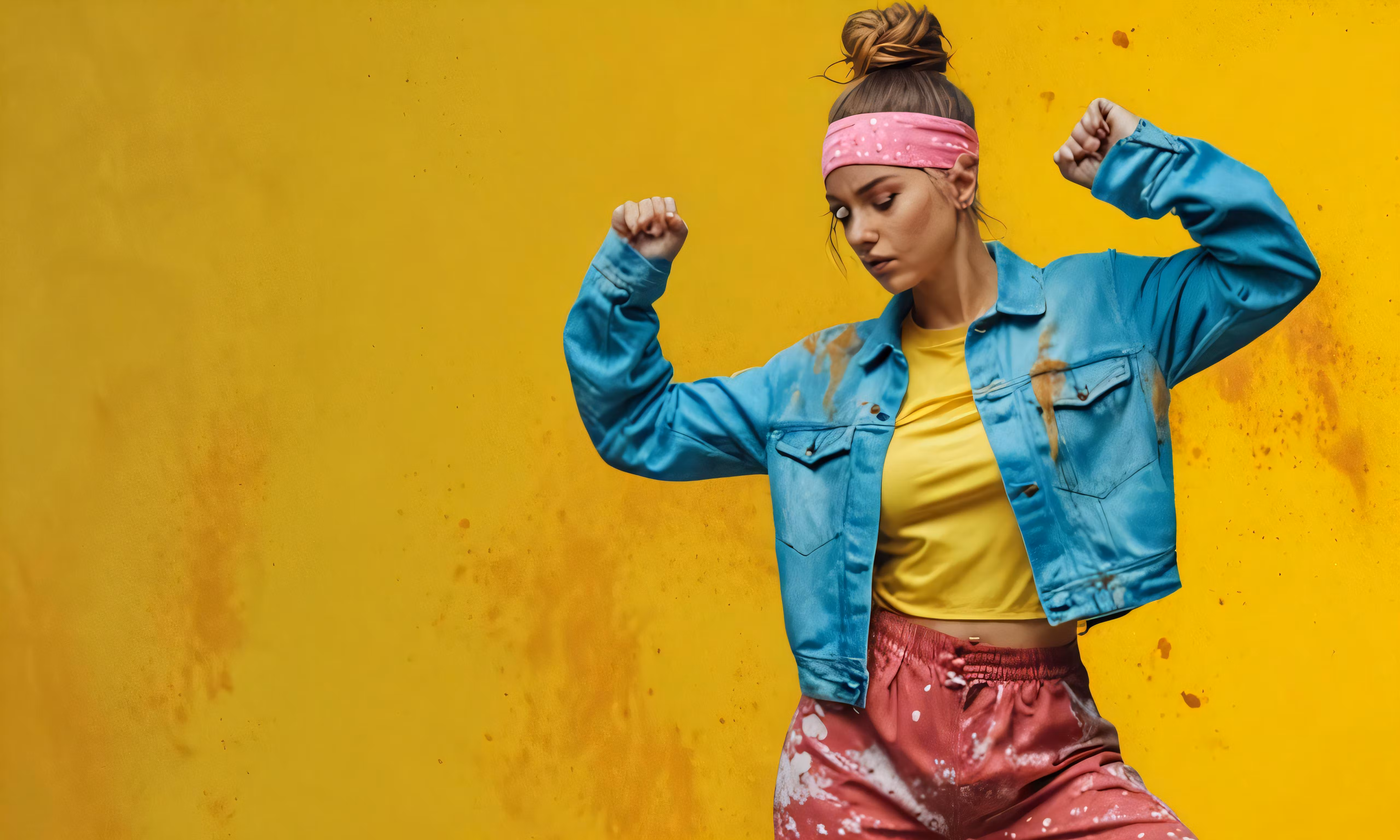 High resolution picture, free to use, a woman wearing a pink and yellow headband is posed against a bright yellow wall