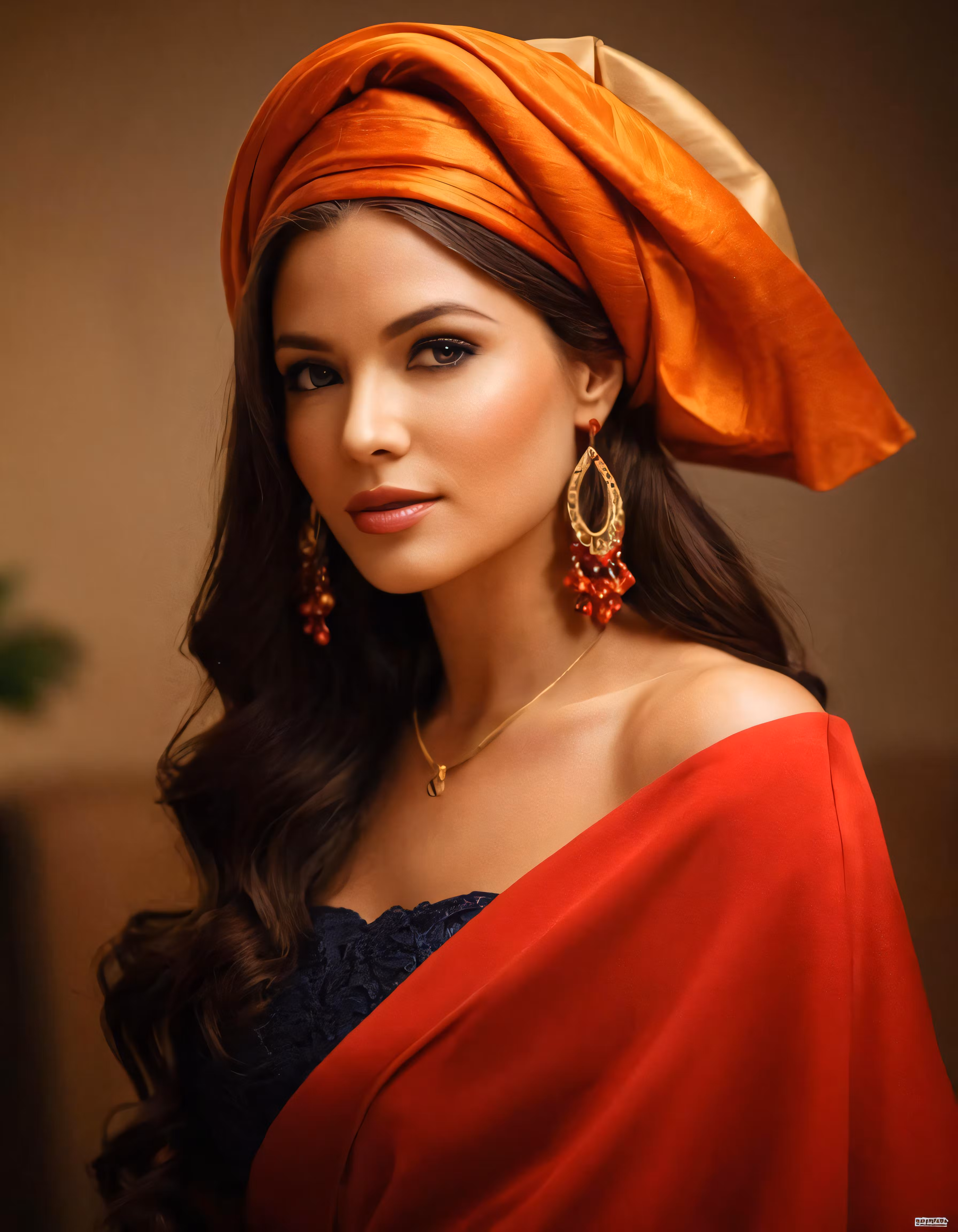 High resolution picture, free to use, a woman wearing a red dress with an orange head wrap