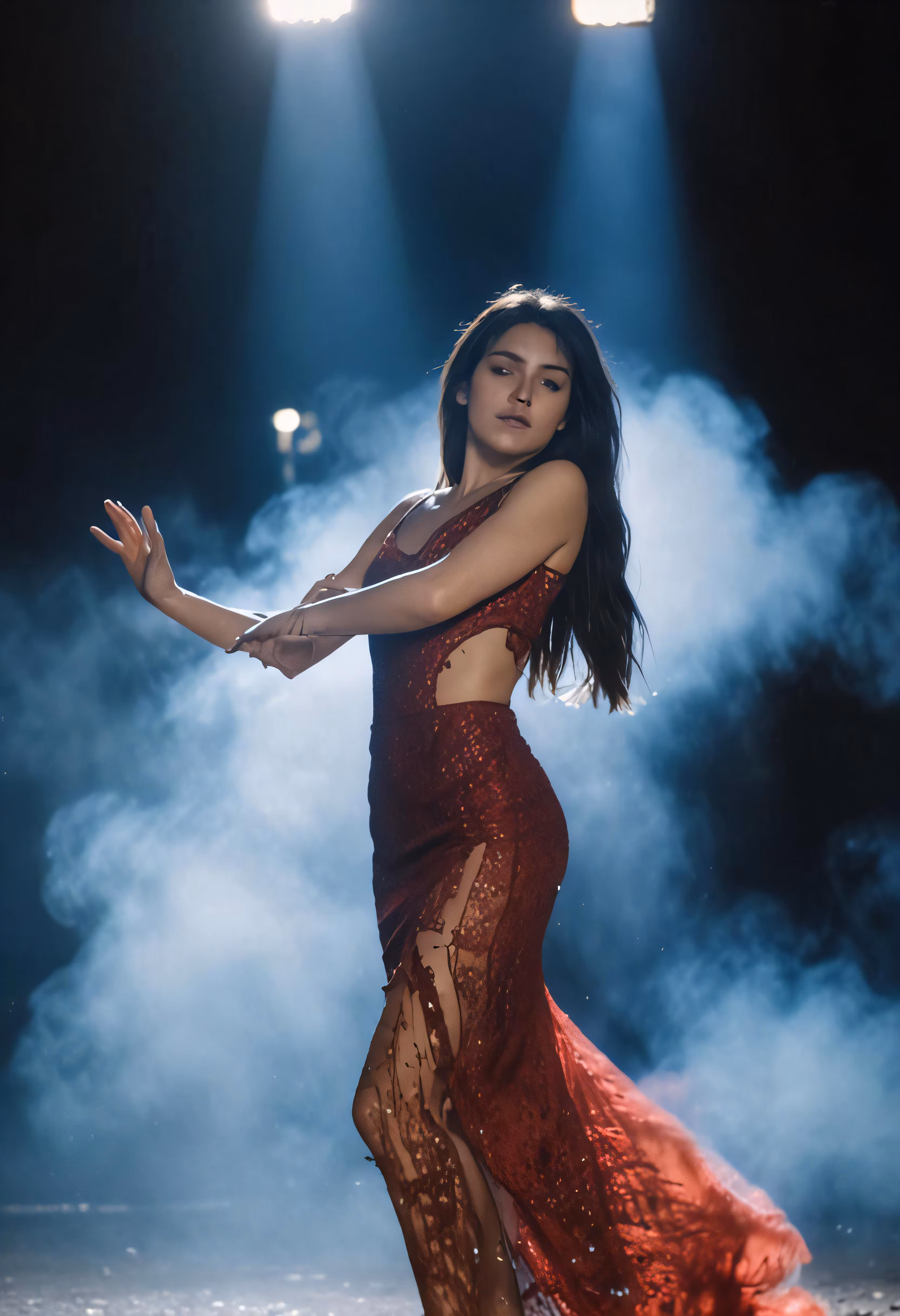 High resolution picture, free to use, a woman wearing a red gown and standing in front of smoke