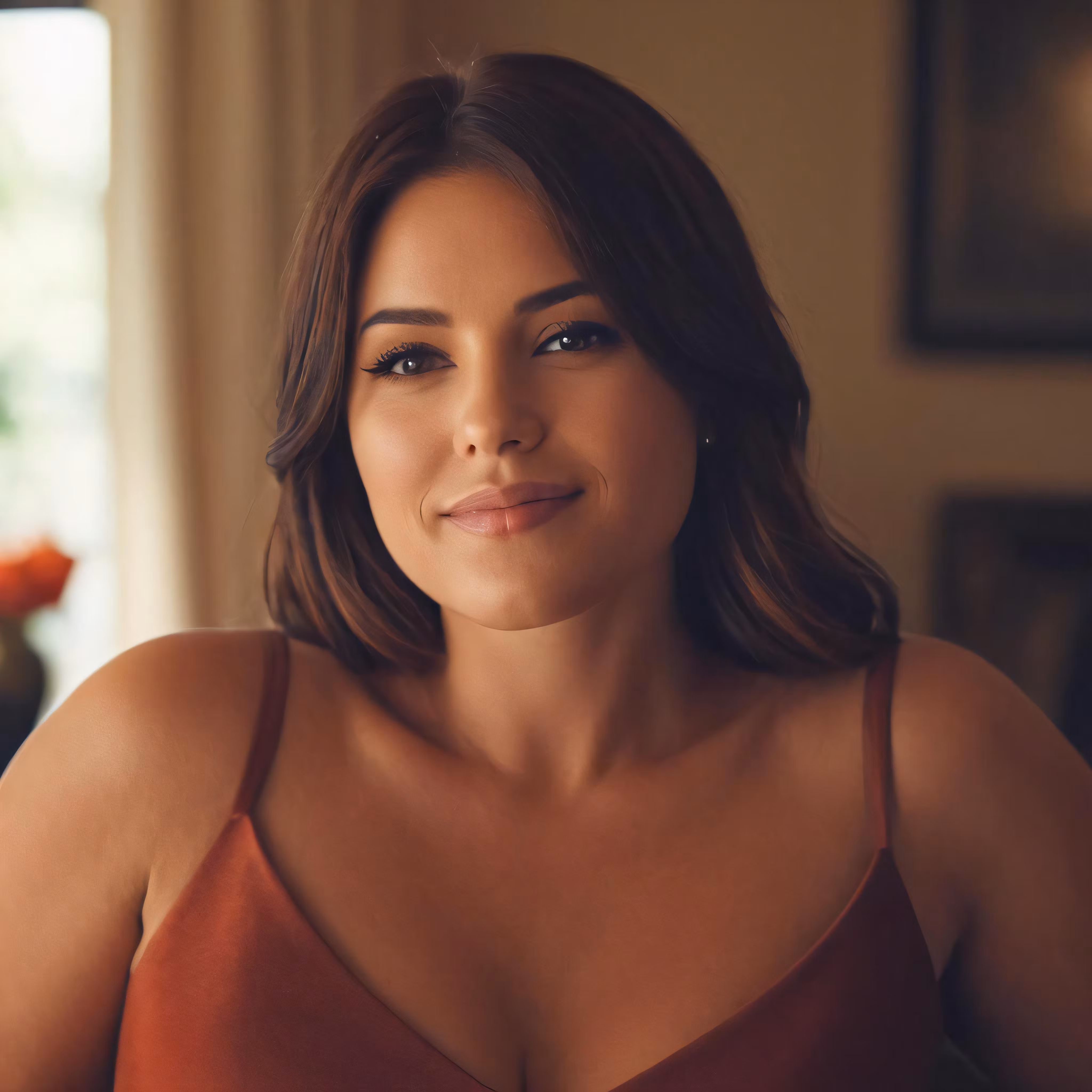 High resolution picture, free to use, a woman wearing a red top in front of a window