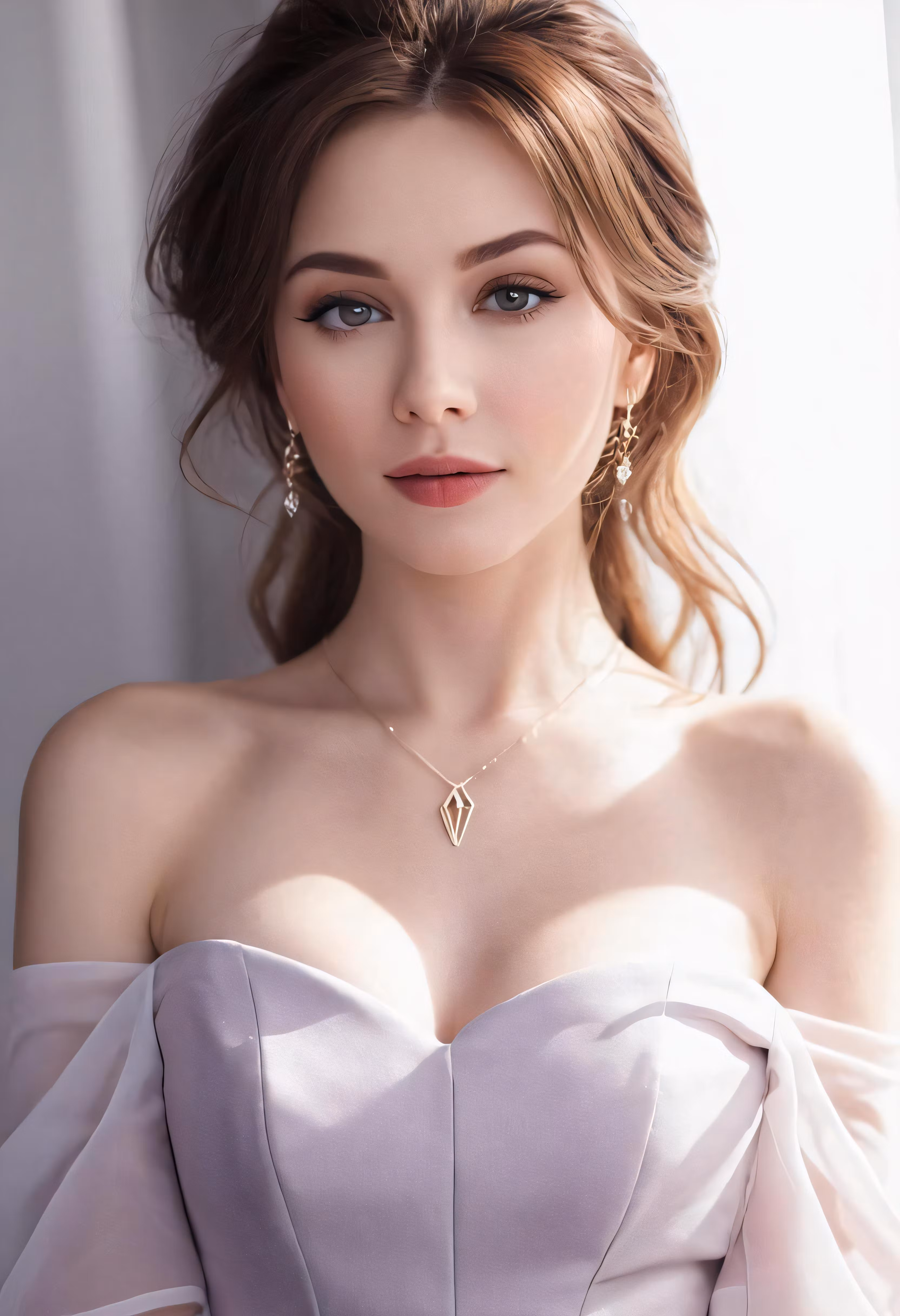High resolution picture, free to use, a woman wearing a white dress and necklace, posing