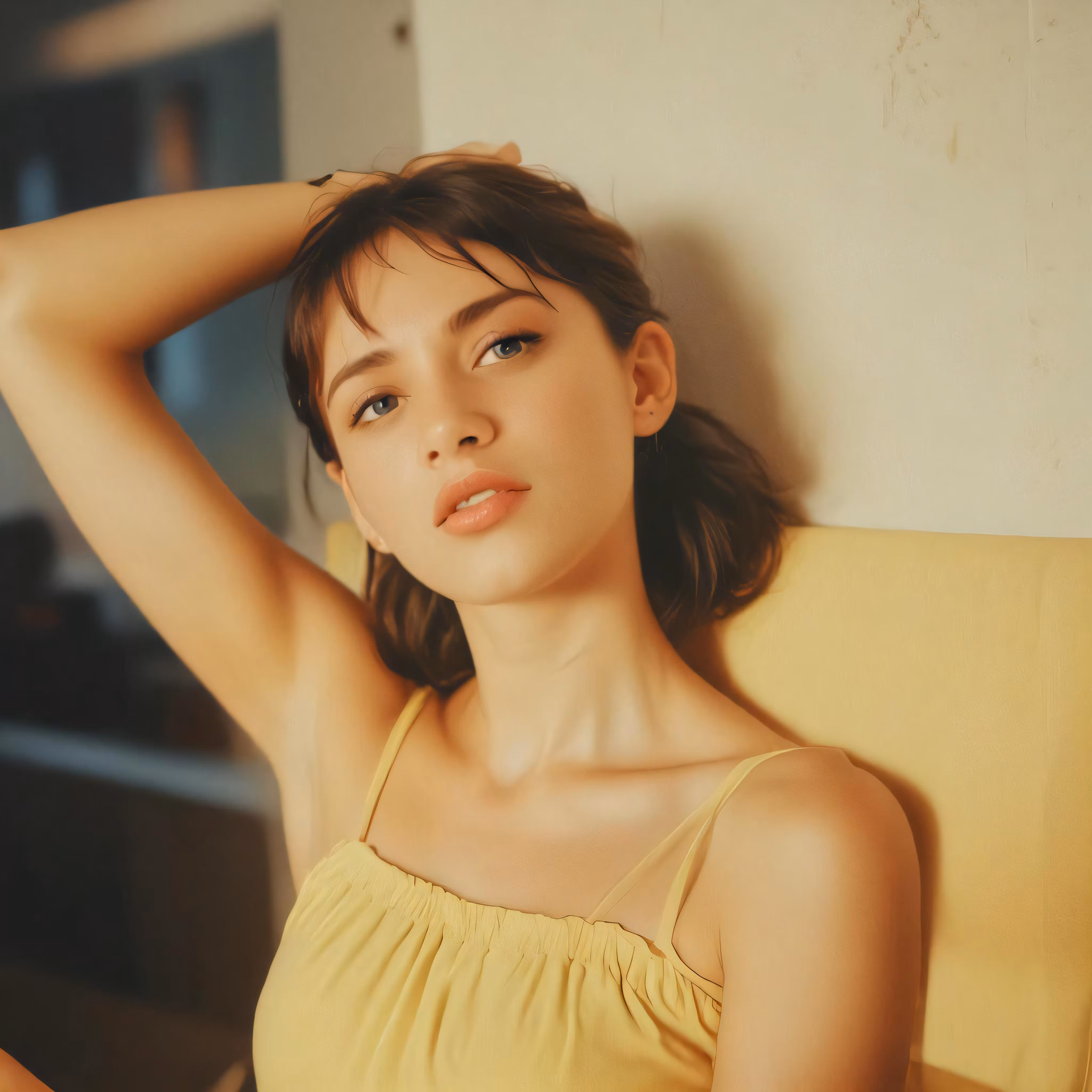 High resolution picture, free to use, a woman wearing a yellow dress with a tan strap