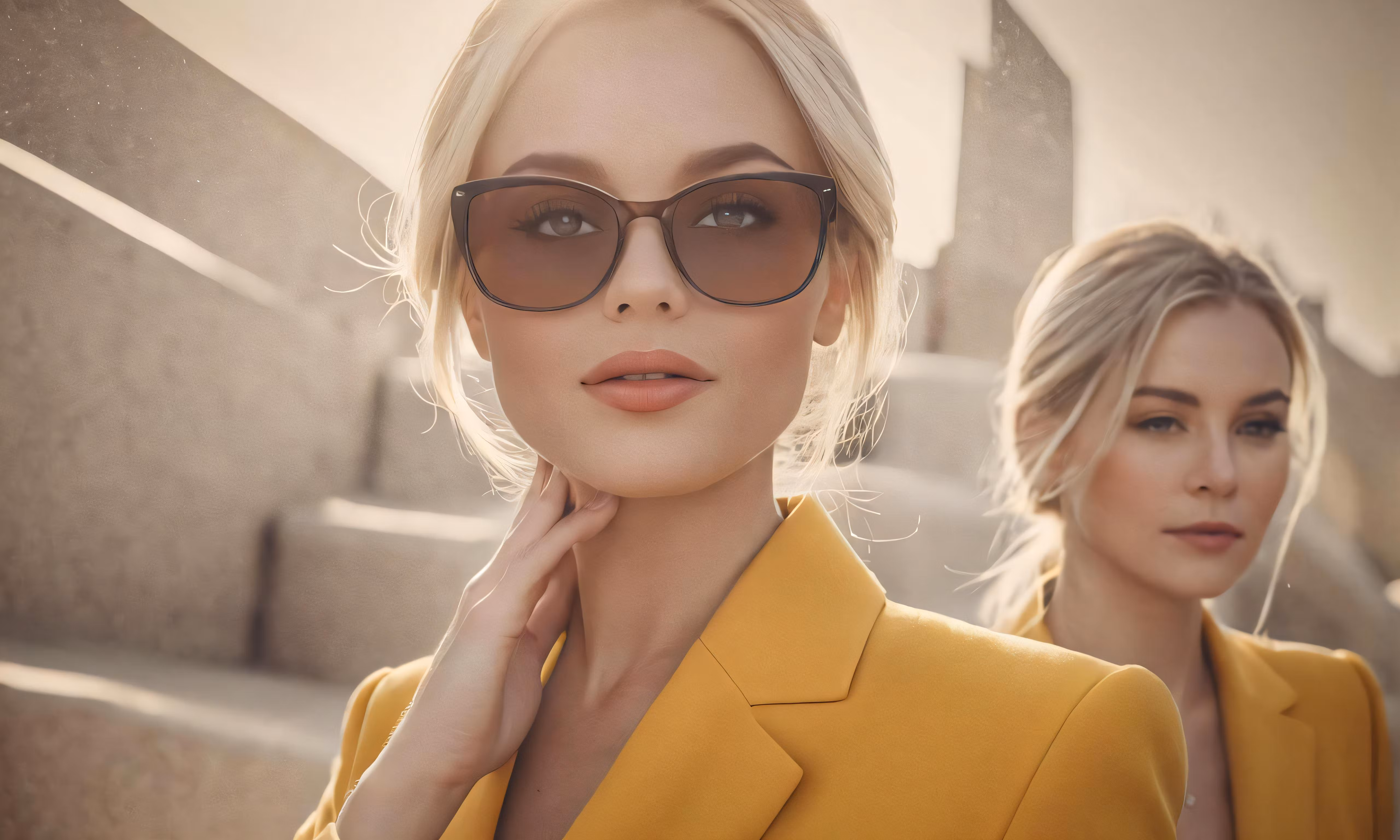 High resolution picture, free to use, a woman wearing a yellow suit and sunglasses