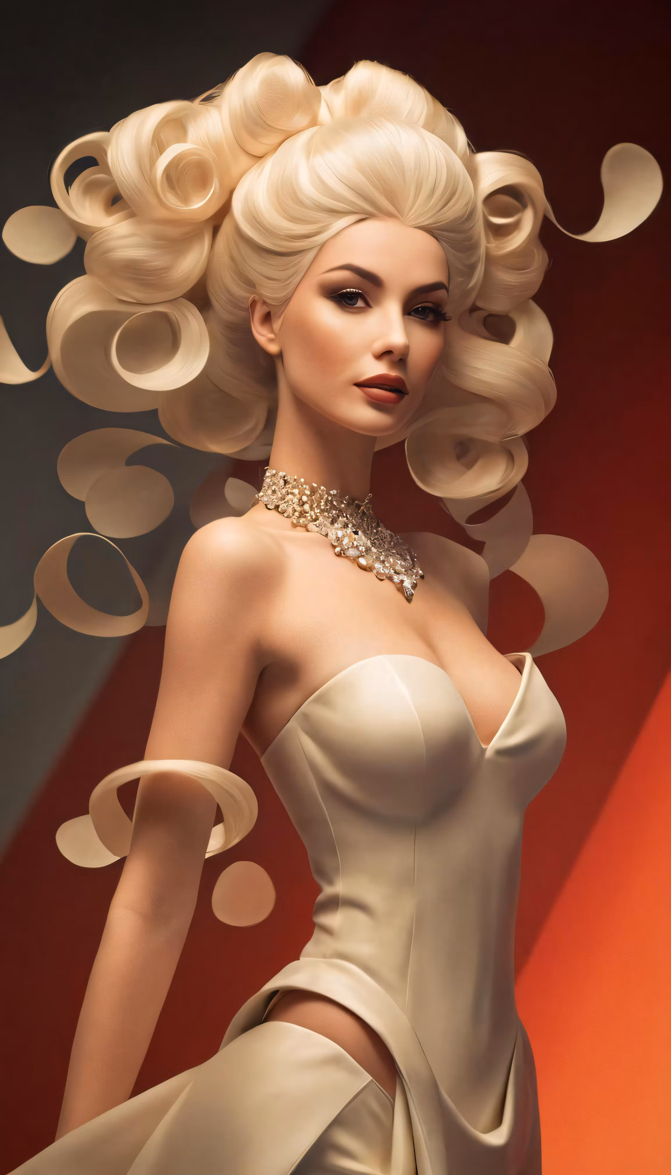 High resolution picture, free to use, a woman wearing an elaborate dress poses in front of wavy hair