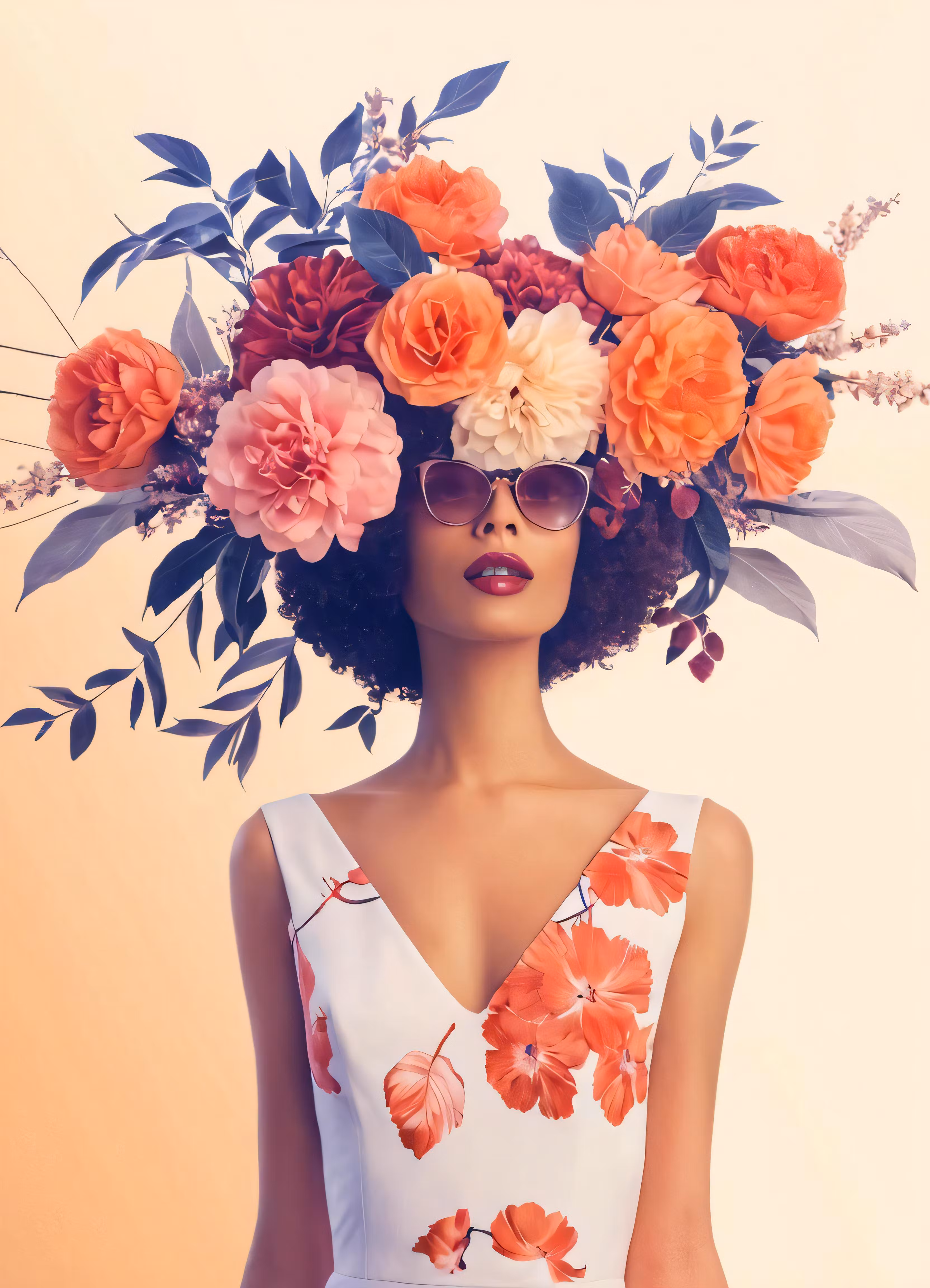 High resolution picture, free to use, a woman wearing flowers on her head and holding a flower wreath