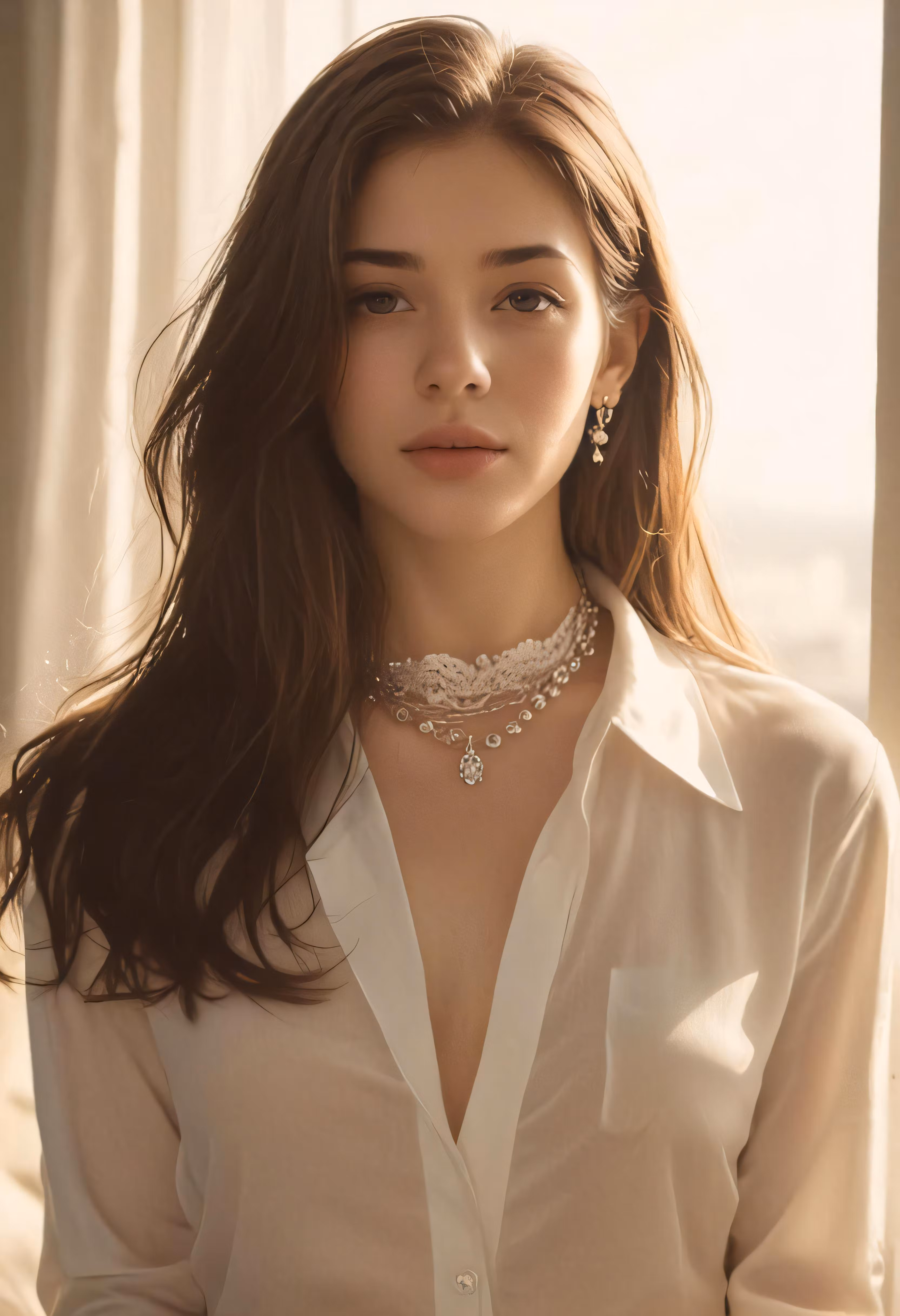 High resolution picture, free to use, a woman wearing jewelry standing in front of a window