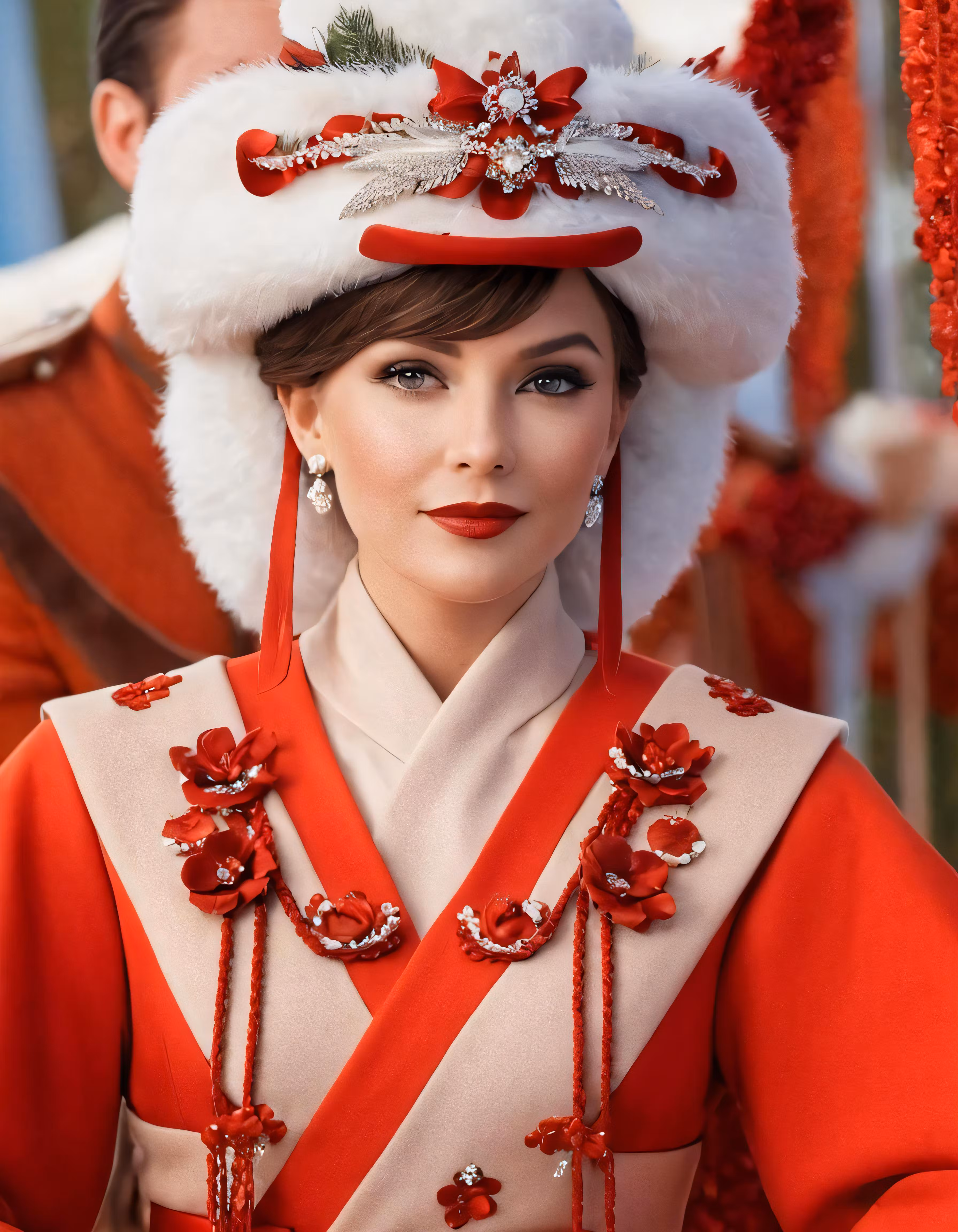 High resolution picture, free to use, a woman wearing red clothing and a white hat