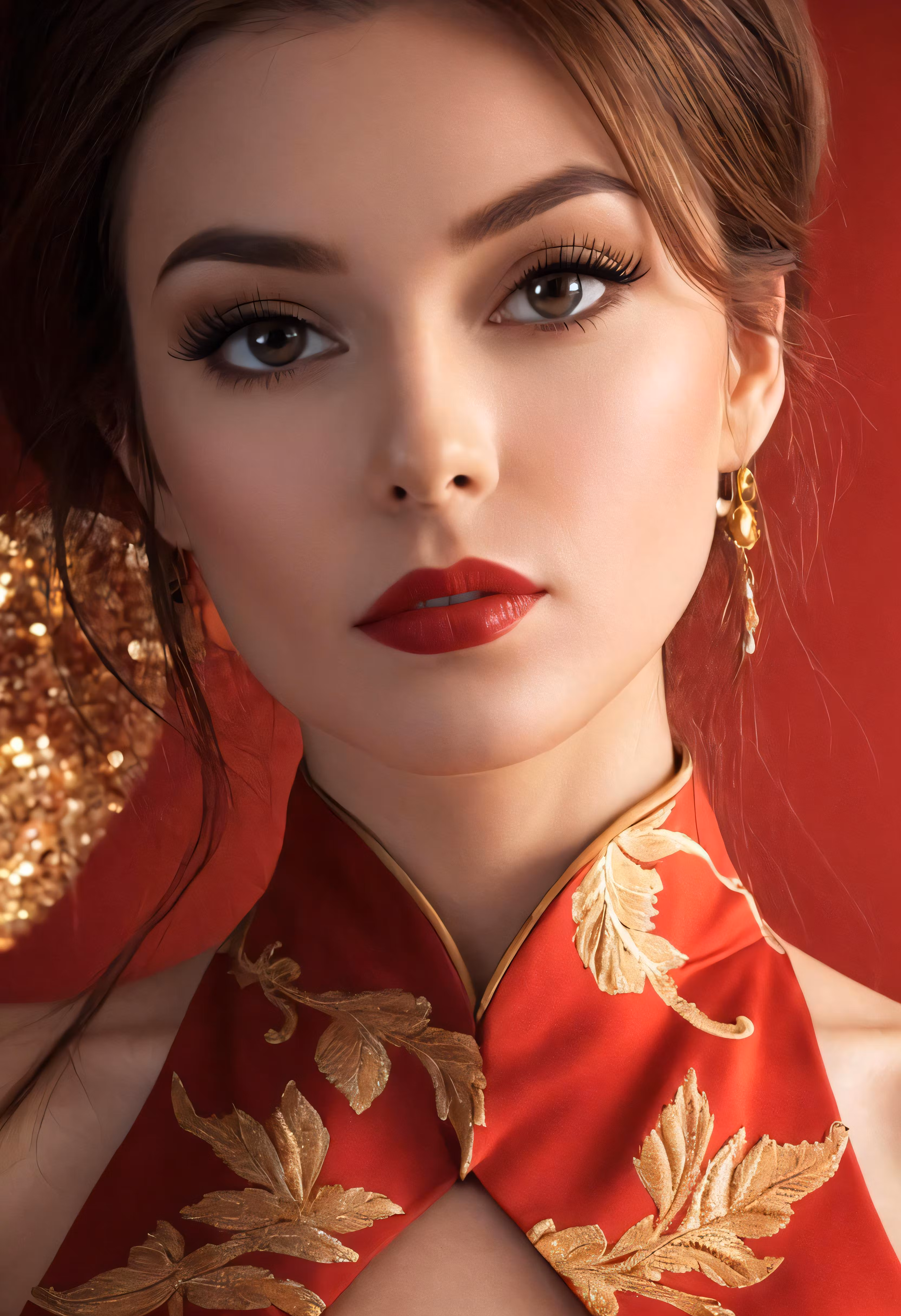 High resolution picture, free to use, a woman wearing red with gold leaf on her dress