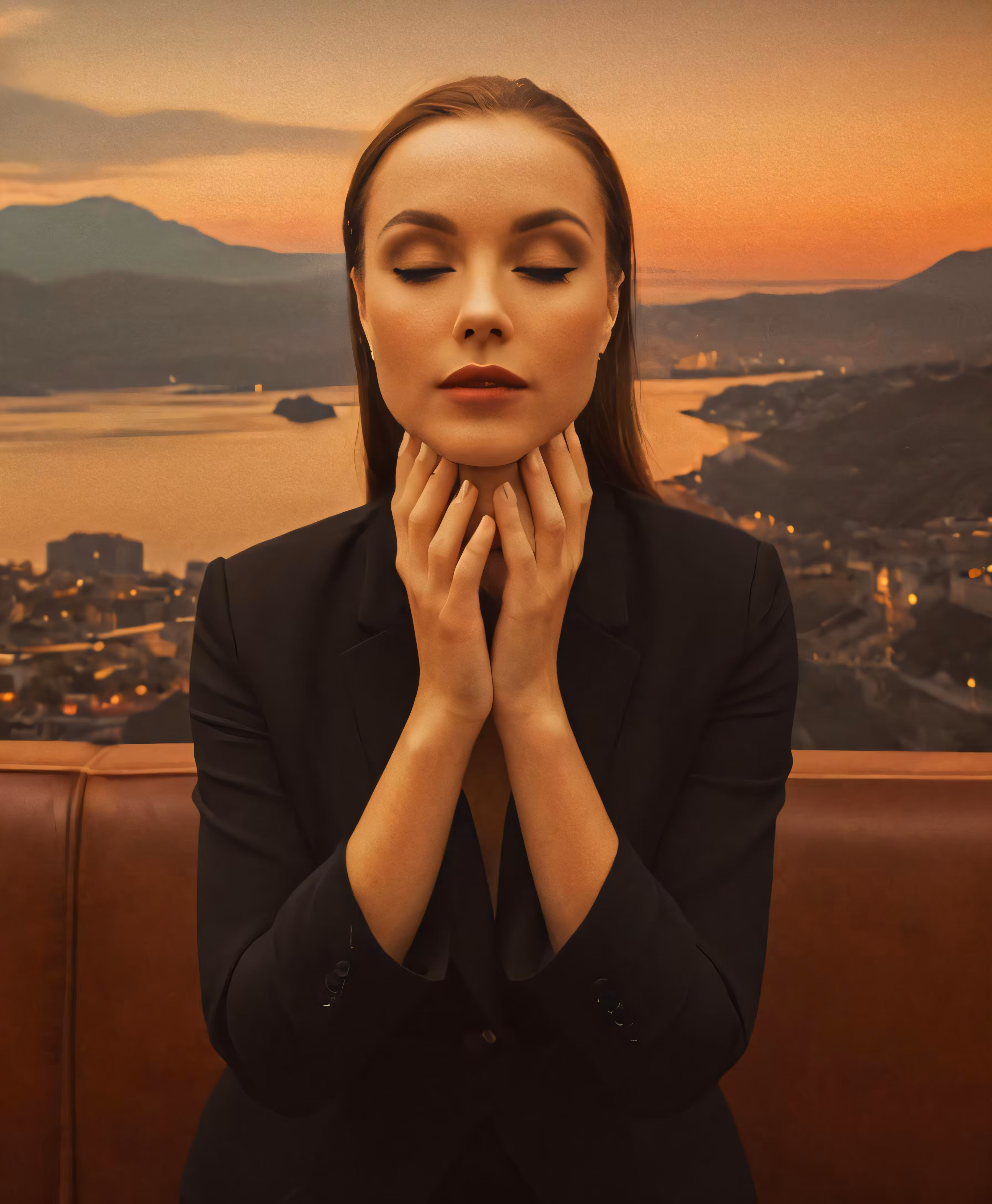 High resolution picture, free to use, a woman who is sitting with her hands on the neck of her head