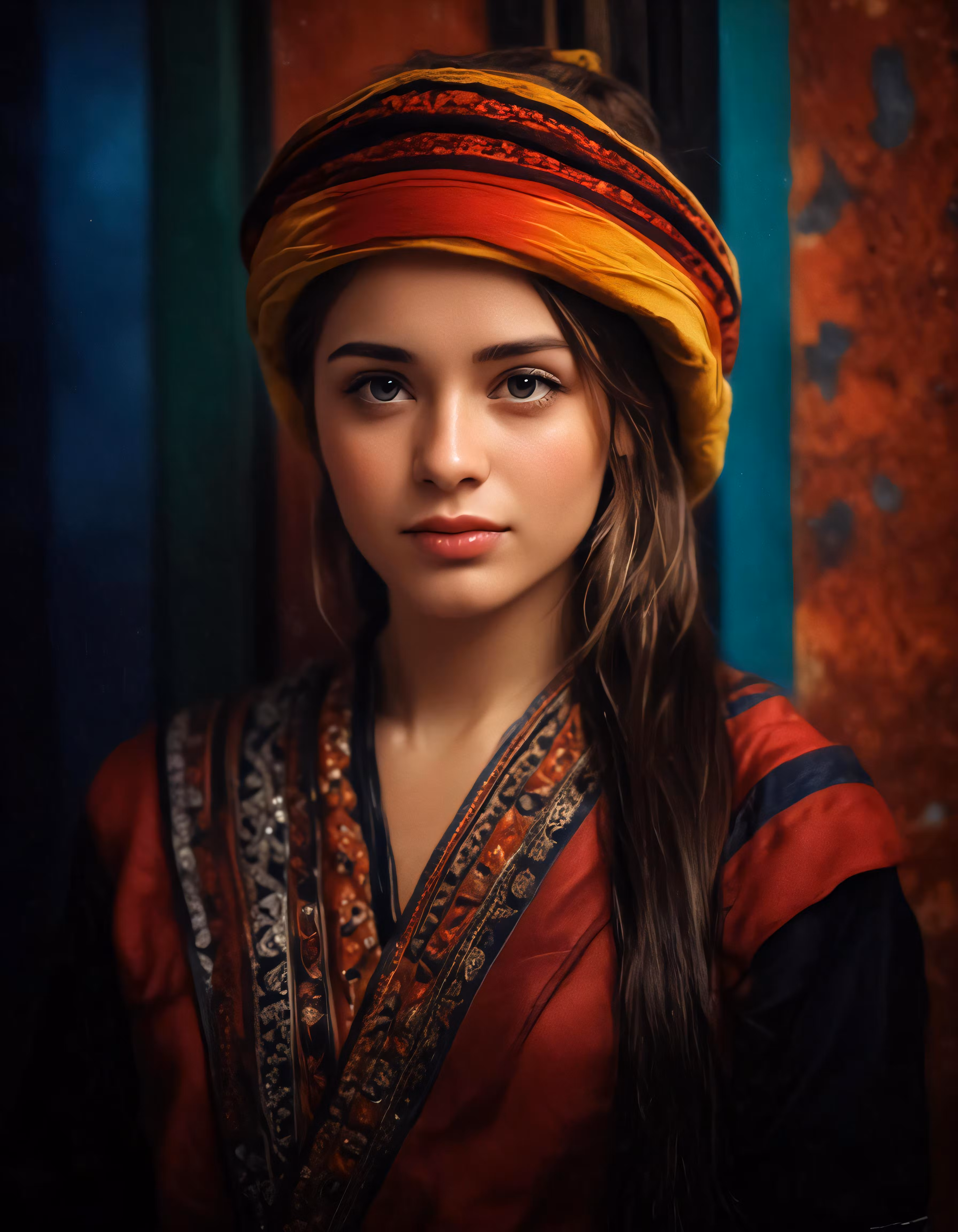 High resolution picture, free to use, a woman with a colorful hat looks at the camera