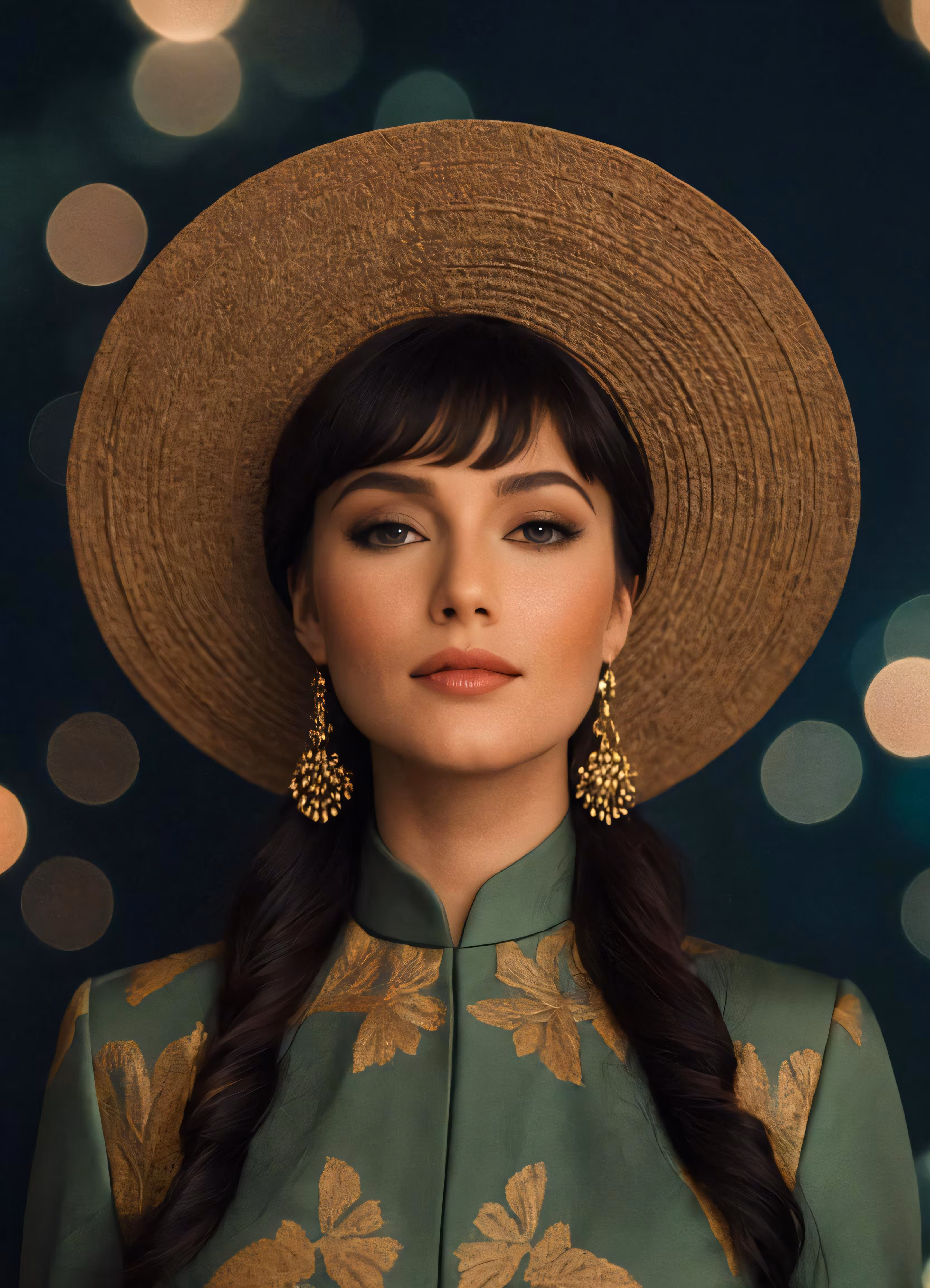 High resolution picture, free to use, a woman with a hat on wearing large earings and a green top