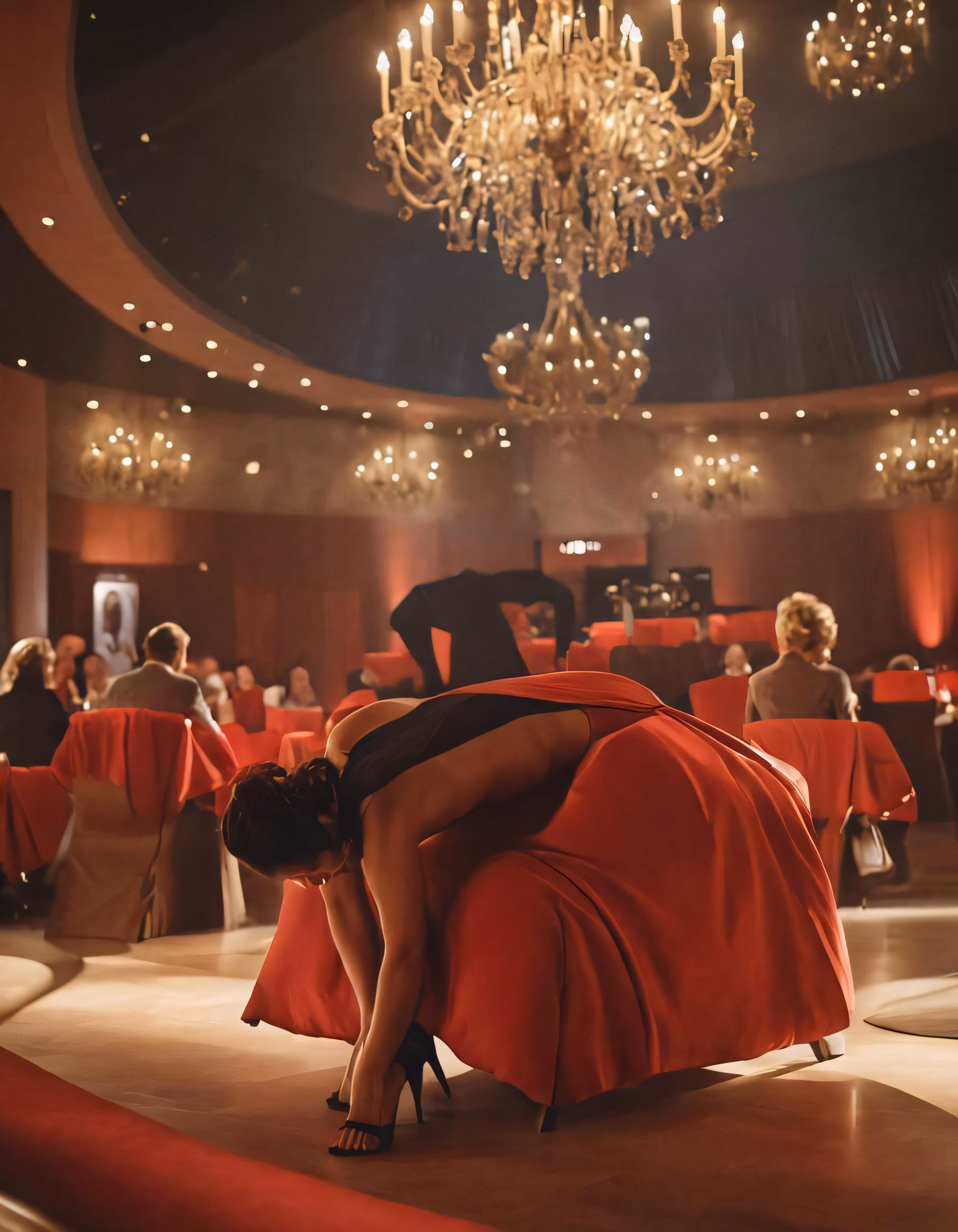 High resolution picture, free to use, a woman with a red dress on leaning over